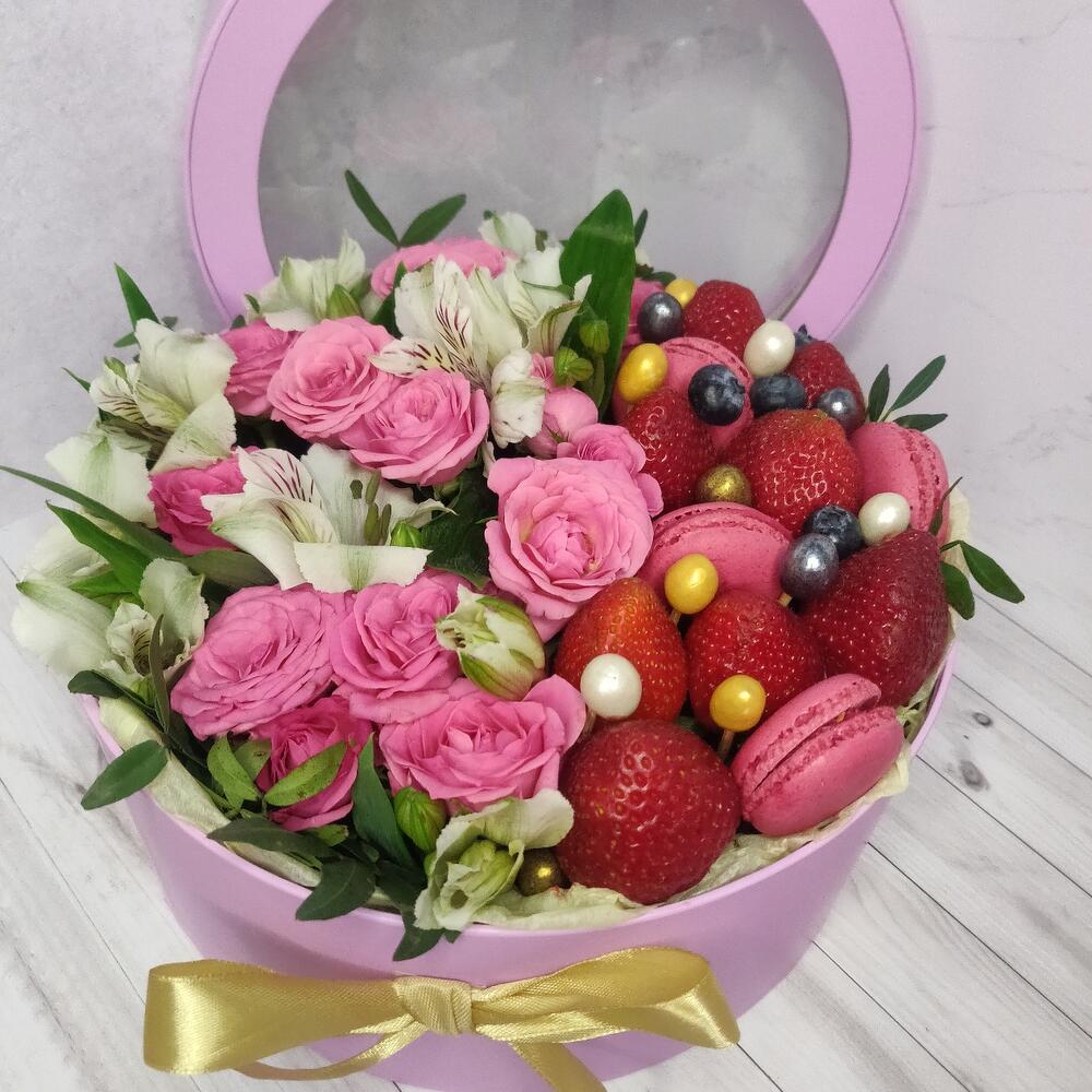 Альстромерия – 3 шт.Клубника – 300 гр.Коробка шляпная – 1 шт.Фисташка – 3 шт.орехи в глазури – 10 шт.кустовые розы – 10 шт.макааруни – 4 шт.