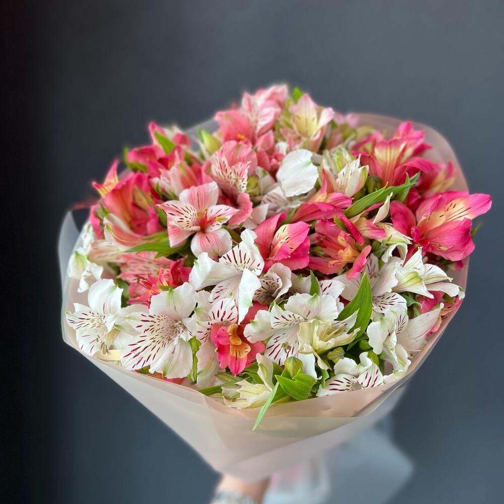 Атласная лента – 1 шт.декоративная упаковка – 1 шт.Альстромерия – 17 шт.