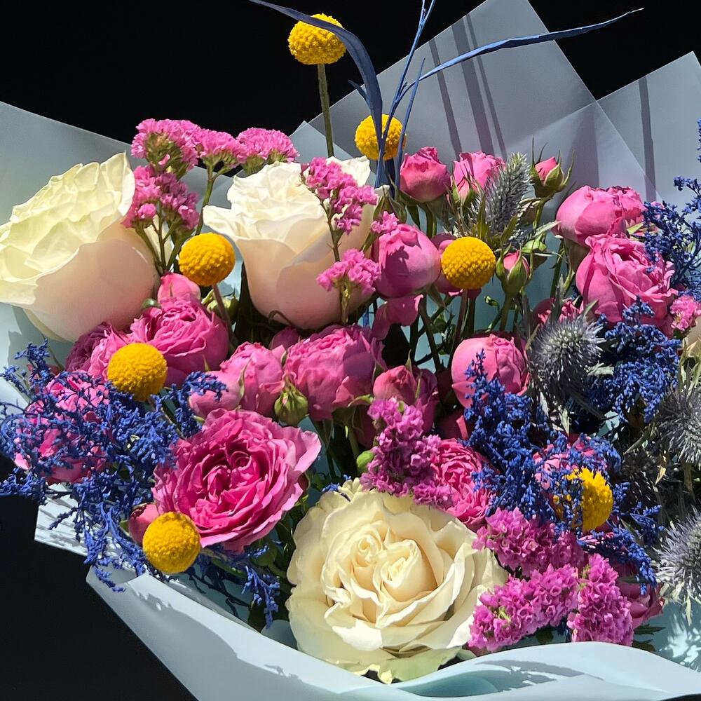 Альстромерии, Кустовые розы, Лизиантусы, Пионовидные розы, Розы, Ромашки