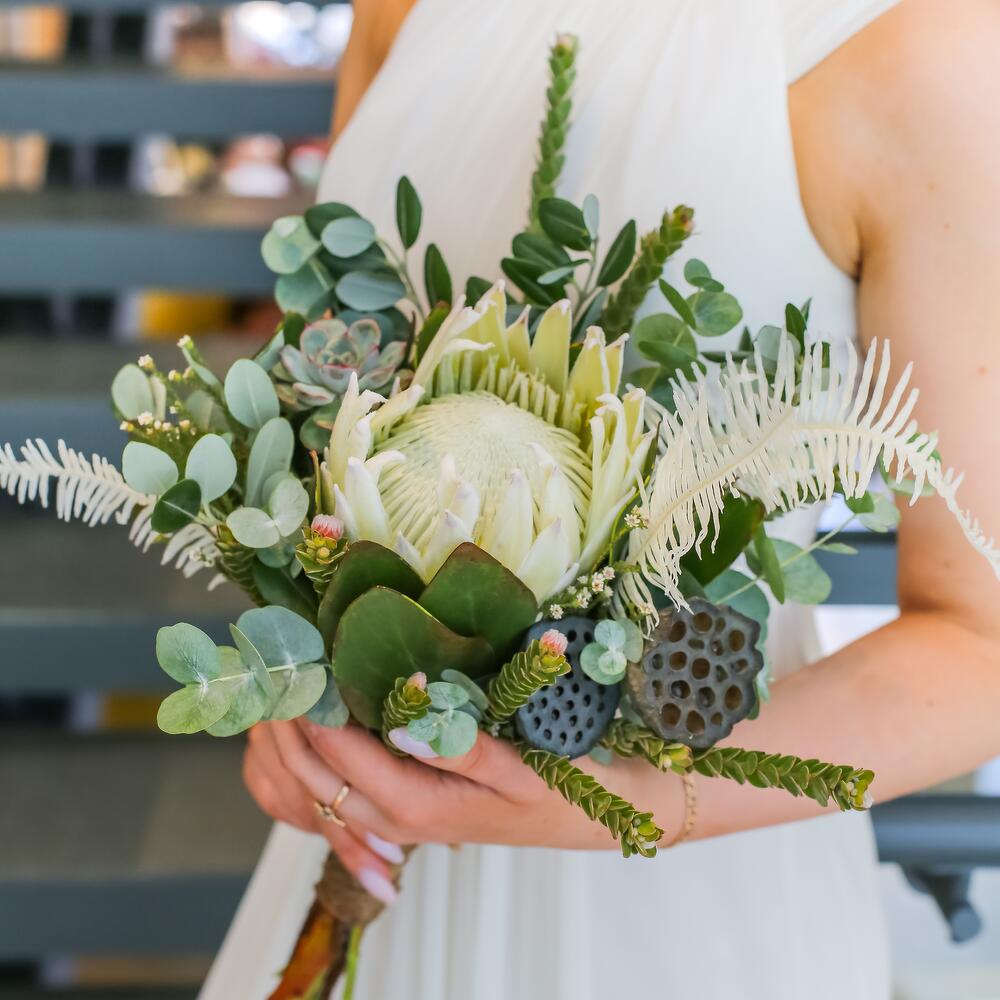 Протея королевская – 1 шт.Нелумбо – 2 шт.Эхеверия – 1 шт.Эвкалипт – 2 шт.амбрелла – 1 шт.Зелень – 5 шт.