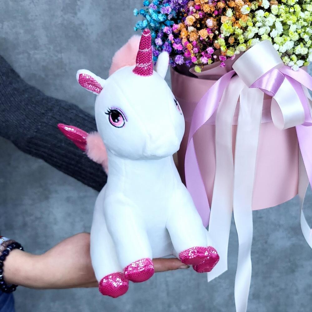 Единорог Евграф и коробочка с радужной гипсофилой