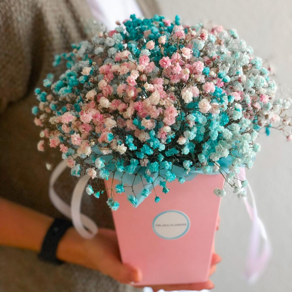Гипсофила – 5 шт.коробка с ручками красная – 1 шт.Тишью – 4 шт.Оазис – 1 шт.