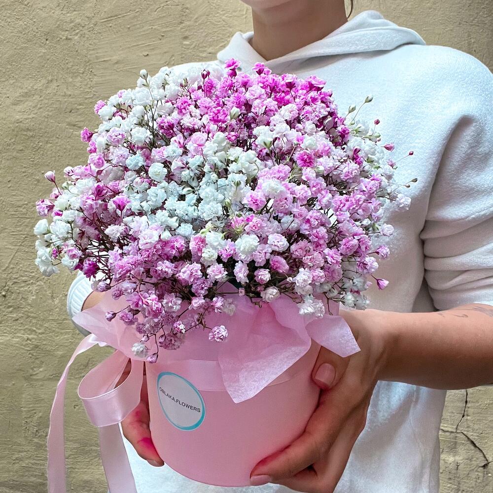 “Сиреневый туман” – композиция из гипсофилы в шляпной коробке