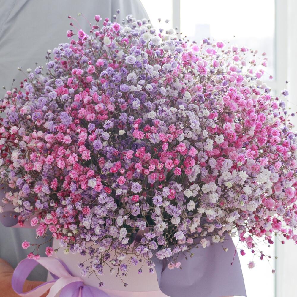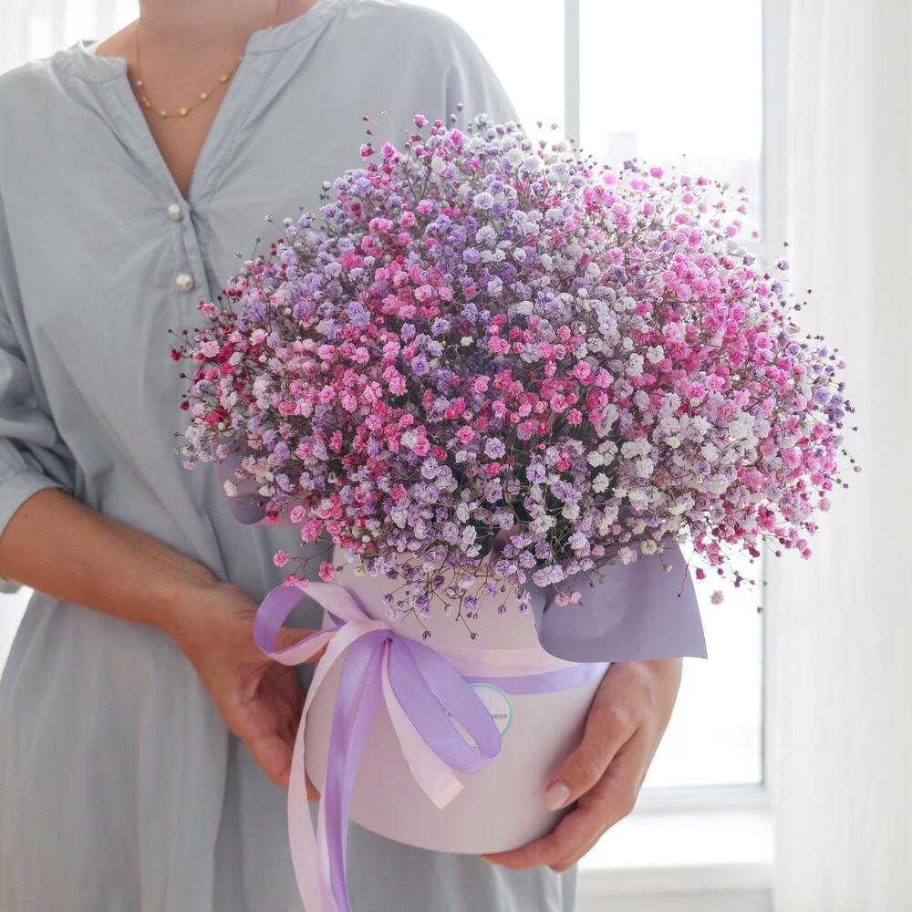 Очаровательная, воздушная композиция из гипсофилы, в шляпной коробке.Цветы стоят в специальной флористической губке,что позволяет им больше оставаться свежими и радовать получателя. Так же композиция в коробке это очень удобно и эффектно, так как не надо ставить букет в вазу и менять воду. Необходимо лишь подливать в губку воду.Инструкция по уходу за цветами прикреплена к каждому заказу.Цветы гипсофилы отличаются стойкостью и даже при высыхании не теряют, декоративности и цвета. Что позволяет, долгое время украшать интерьер в качестве сухоцветов.Подпишем открытку с вашими пожеланиями бесплатно