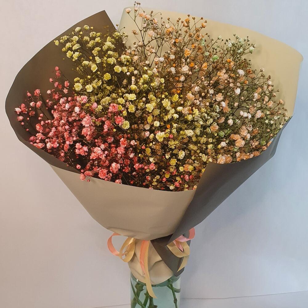 Гипсофила – 7 шт.Упаковка дизайнерская – 1 шт.Лента атласная – 2 шт.