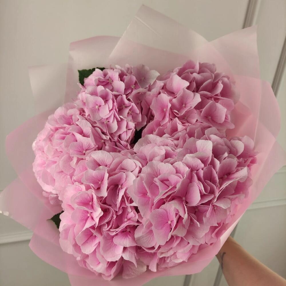 Гортензия – 5 шт.Матовая пленка – 1 шт.Лента – 1 шт.любовь флориста (бесплатно) – 1 шт.