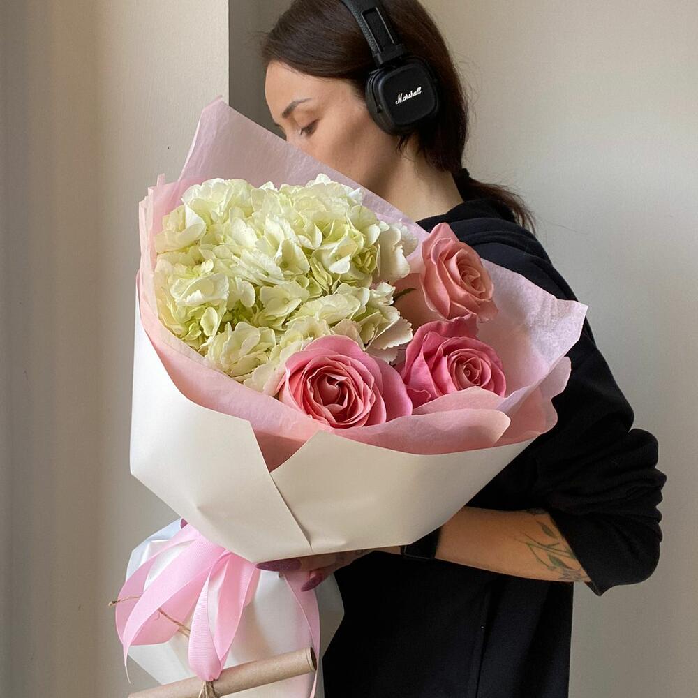 Гортензии, Кустовые розы, Пионовидные розы, Розы