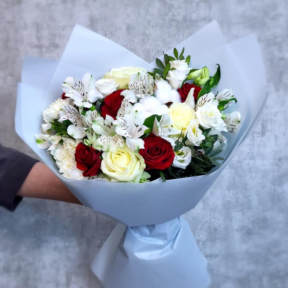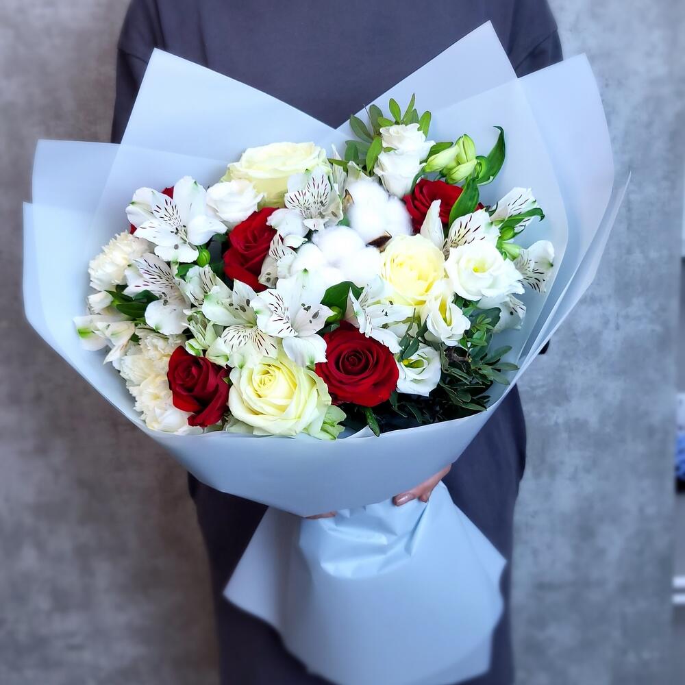 Альстромерии, Гвоздики, Кустовые розы, Лизиантусы, Розы, Хризантемы