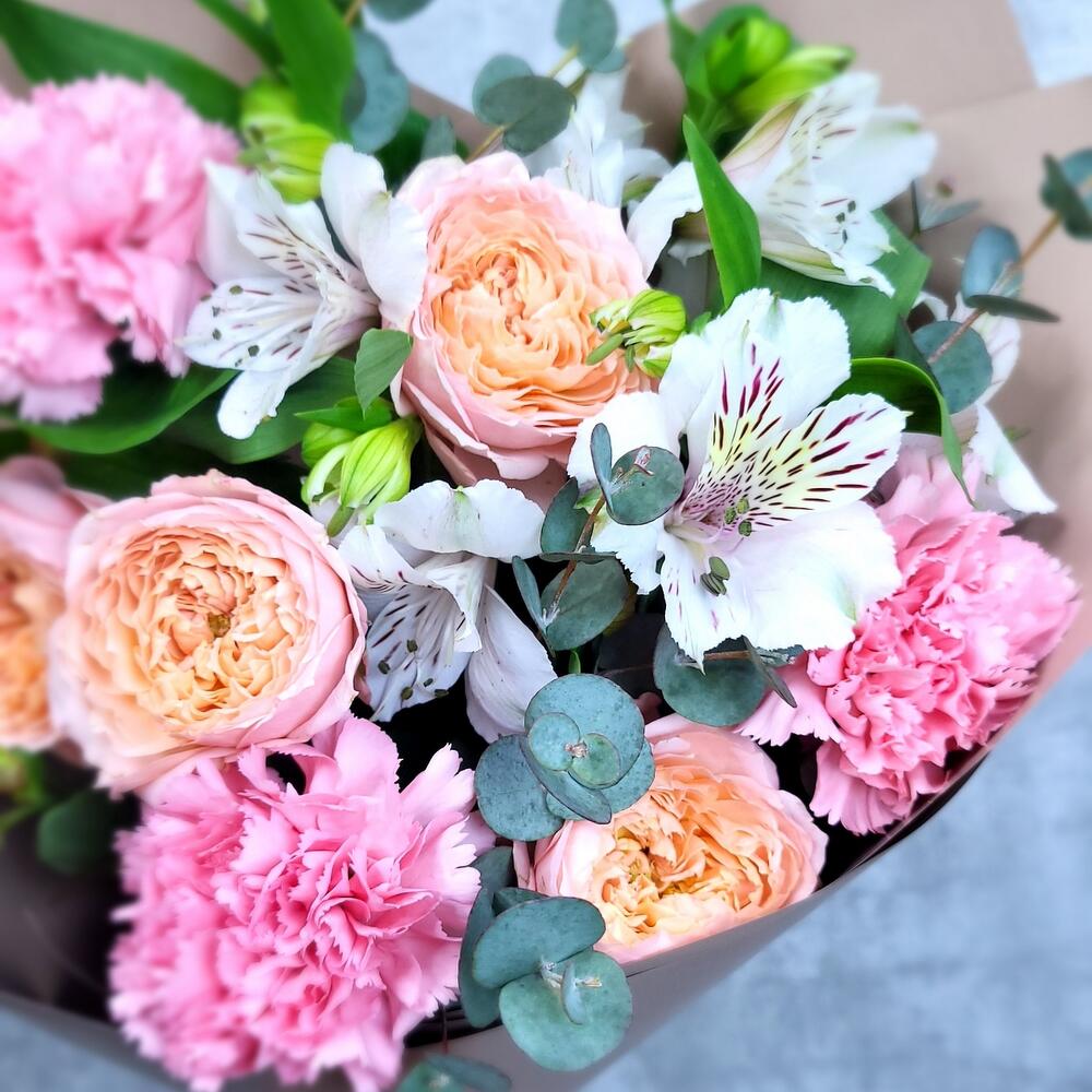 Альстромерия – 3 шт.Эвкалипт – 1 шт.Гвоздика – 3 шт.Роза кустовая пионовидная – 1 шт.Упаковка дизайнерская – 1 шт.
