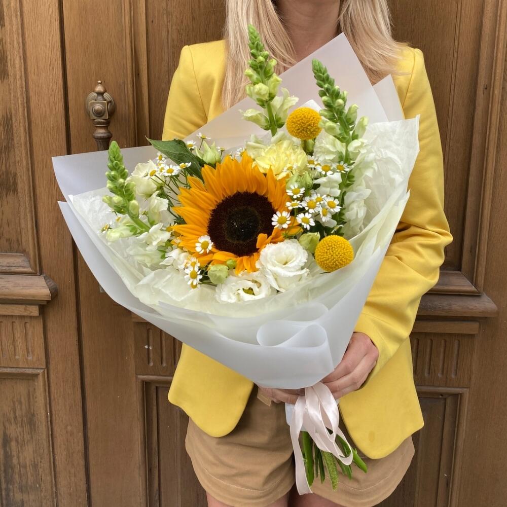 Солнечный яркий букет, выполненный из подсолнуха, лизиантуса, маттиолы и краспедии.Такой букет точно понравится яркой и энергичной получательнице, и будет долго радовать её.К букету прилагается открытка с вашими пожеланиями, инструкцию по уходу за цветами и приятный комплимент от нашего магазина – шоколадка.Мы также будем рады отправить вместе с букетом конфеты, шоколад ручной работы или б/а вино по вашим пожеланиям, просто напишите нам в личные сообщения. Заказывая наш букет, Вы всегда получите исключительный сервис и заботу о клиенте