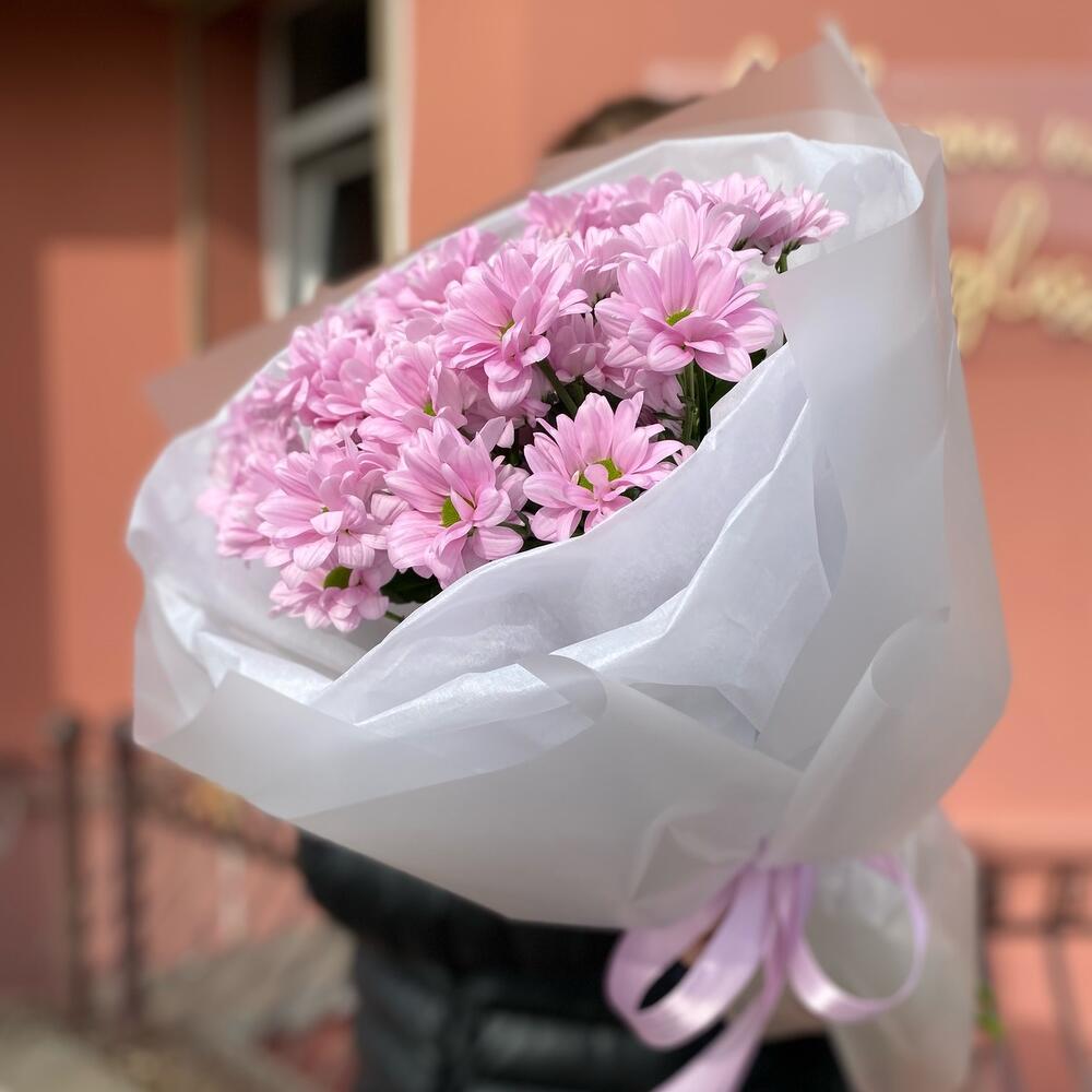 Лента атласная – 1 шт. Тишью – 1 шт. Ромашковая хризантема – 5 шт. Дизайнерская упаковка – 1 шт.