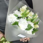 Альстромерия – 2 шт.Рускус – 3 шт.Хризантема кустовая – 2 шт.Лента атласная – 1 шт.Упаковка дизайнерская – 1 шт.