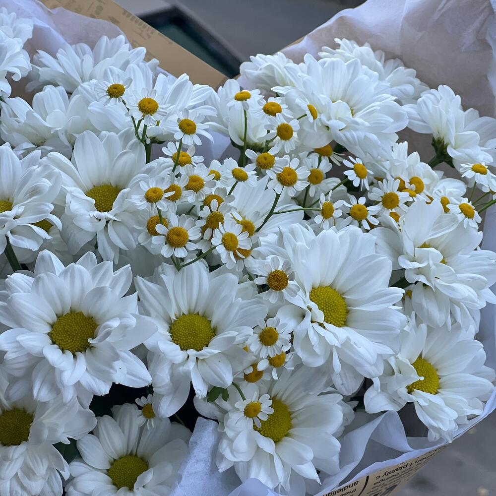 Хризантема кустовая – 5 шт.Ромашка кустовая – 2 шт.Сухоцветы – 3 шт.Упаковка дизайнерская – 1 шт.Кризал (подкормка) – 1 шт.