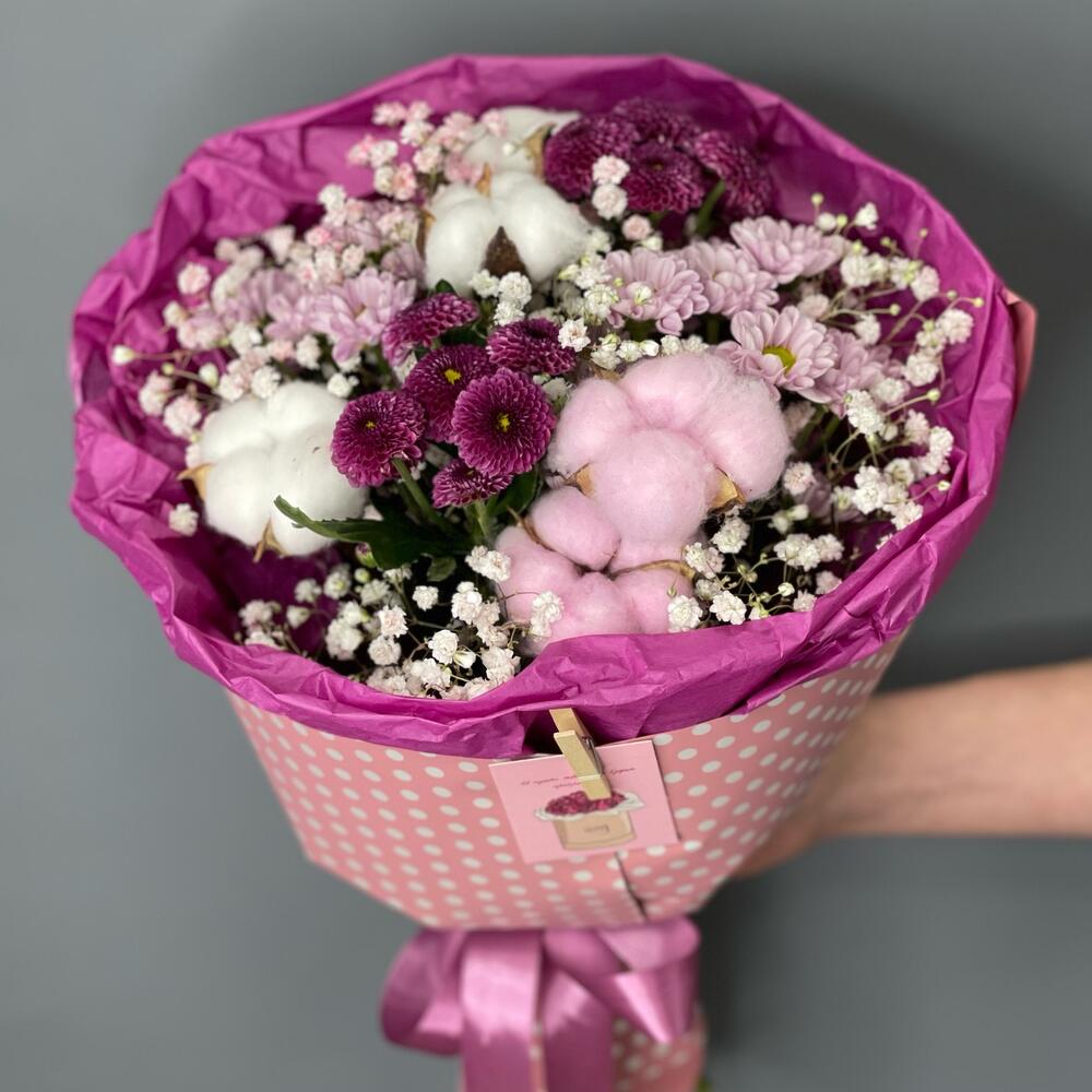 Гипсофила – 2 шт.Хлопок – 5 шт.Хризантема Сантини – 4 шт.Лента атласная – 1 шт.Упаковка дизайнерская – 1 шт.Открыточка с вашими пожеланиями – 1 шт.