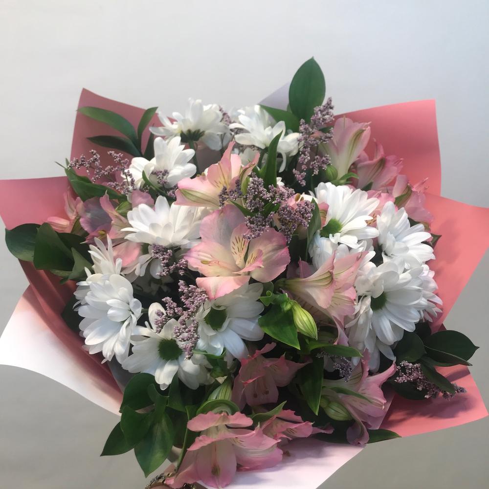Альстромерия – 4 шт.Хризантема кустовая – 3 шт.Рускус Израиль – 6 шт.Лимониум сиреневый – 1 шт.