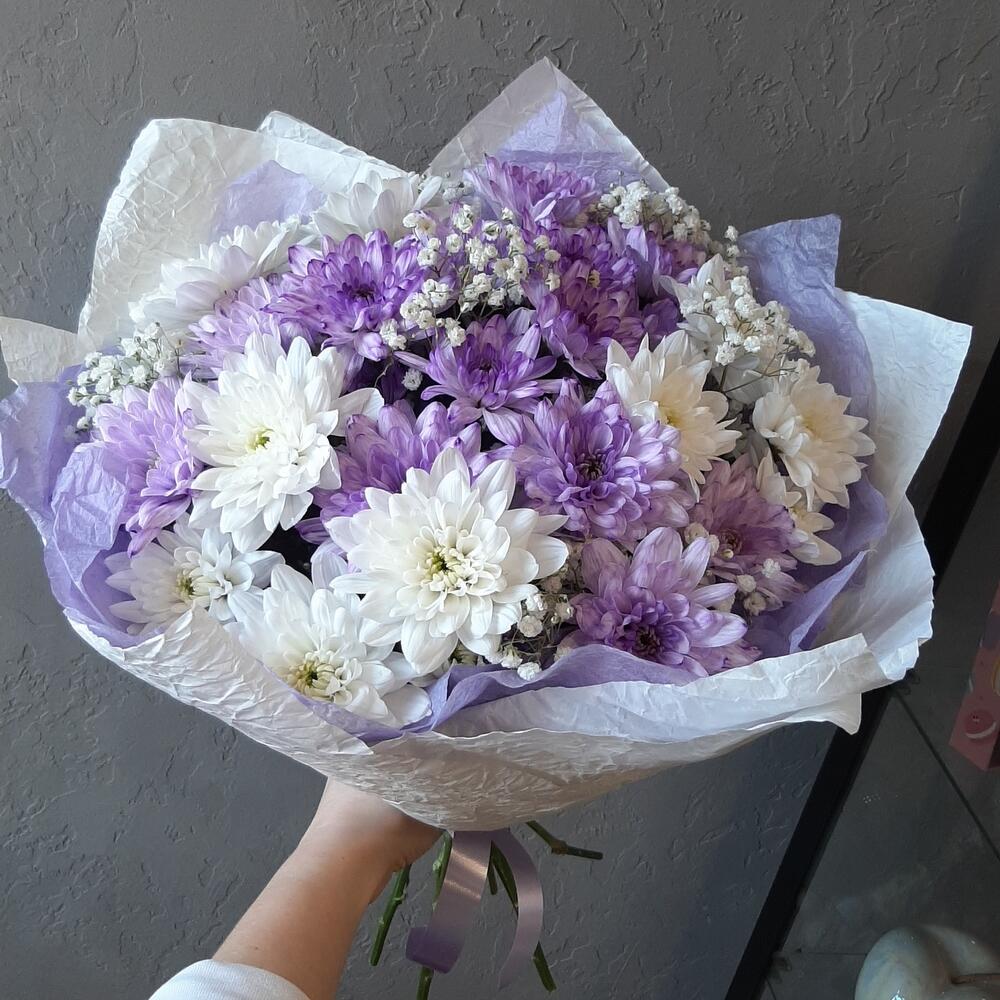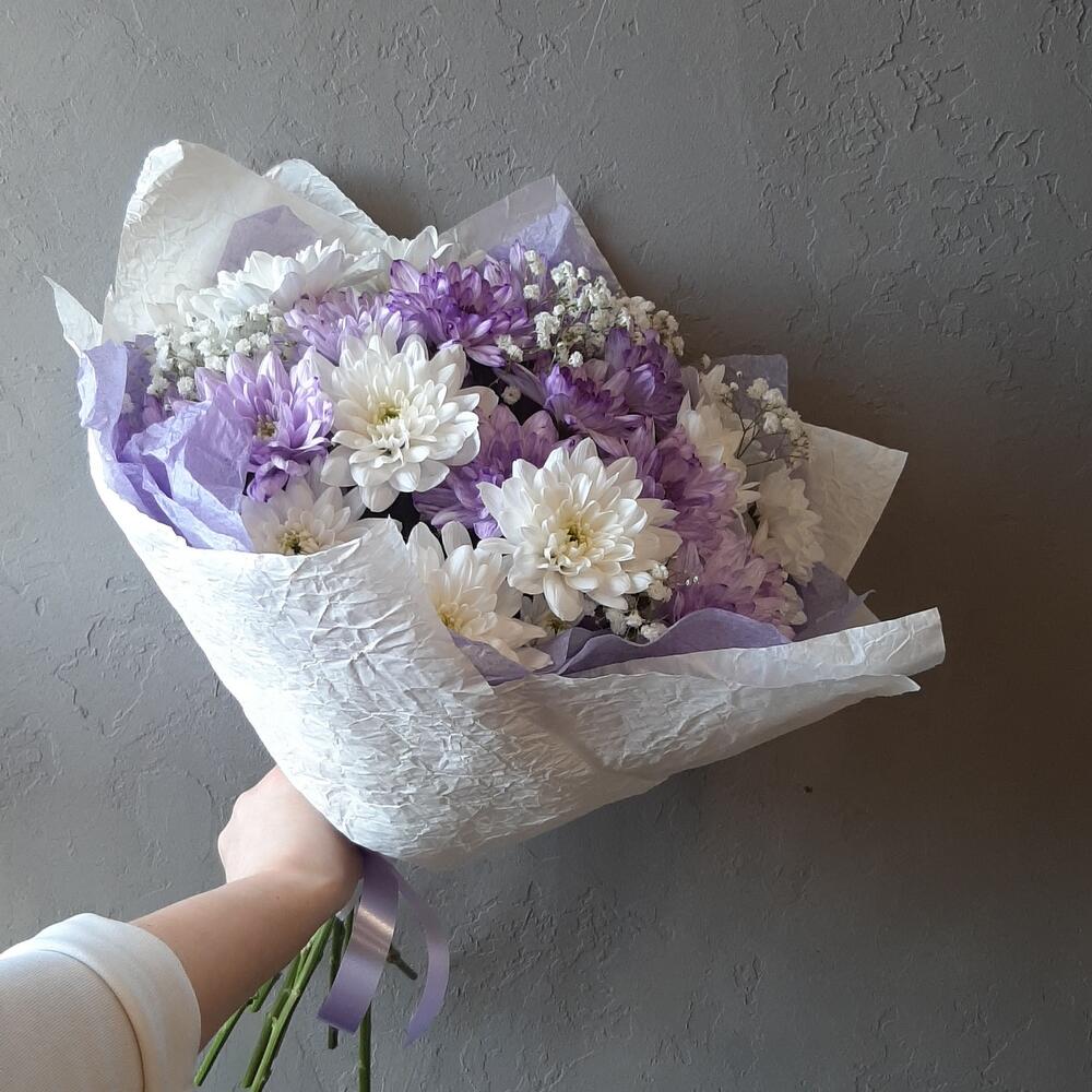 Хризантема кустовая белая – 3 шт.Хризантема кустовая крашенная – 4 шт.Гипсофила – 3 шт.Упаковка дизайнерская – 1 шт.