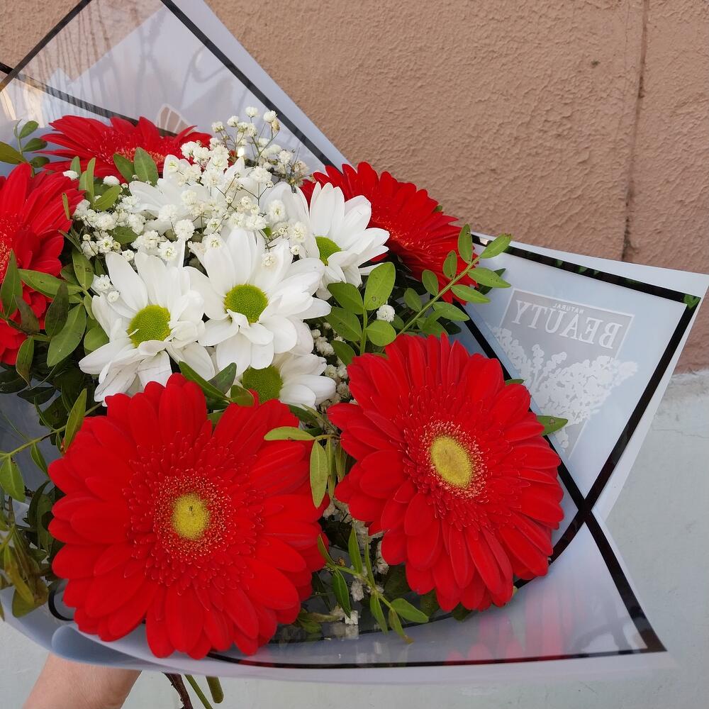 Гипсофила – 1 шт.Гербера – 5 шт.Фисташка – 10 шт.Упаковка дизайнерская – 3 шт.бакарди ромашка хризантема кустовая – 1 шт.