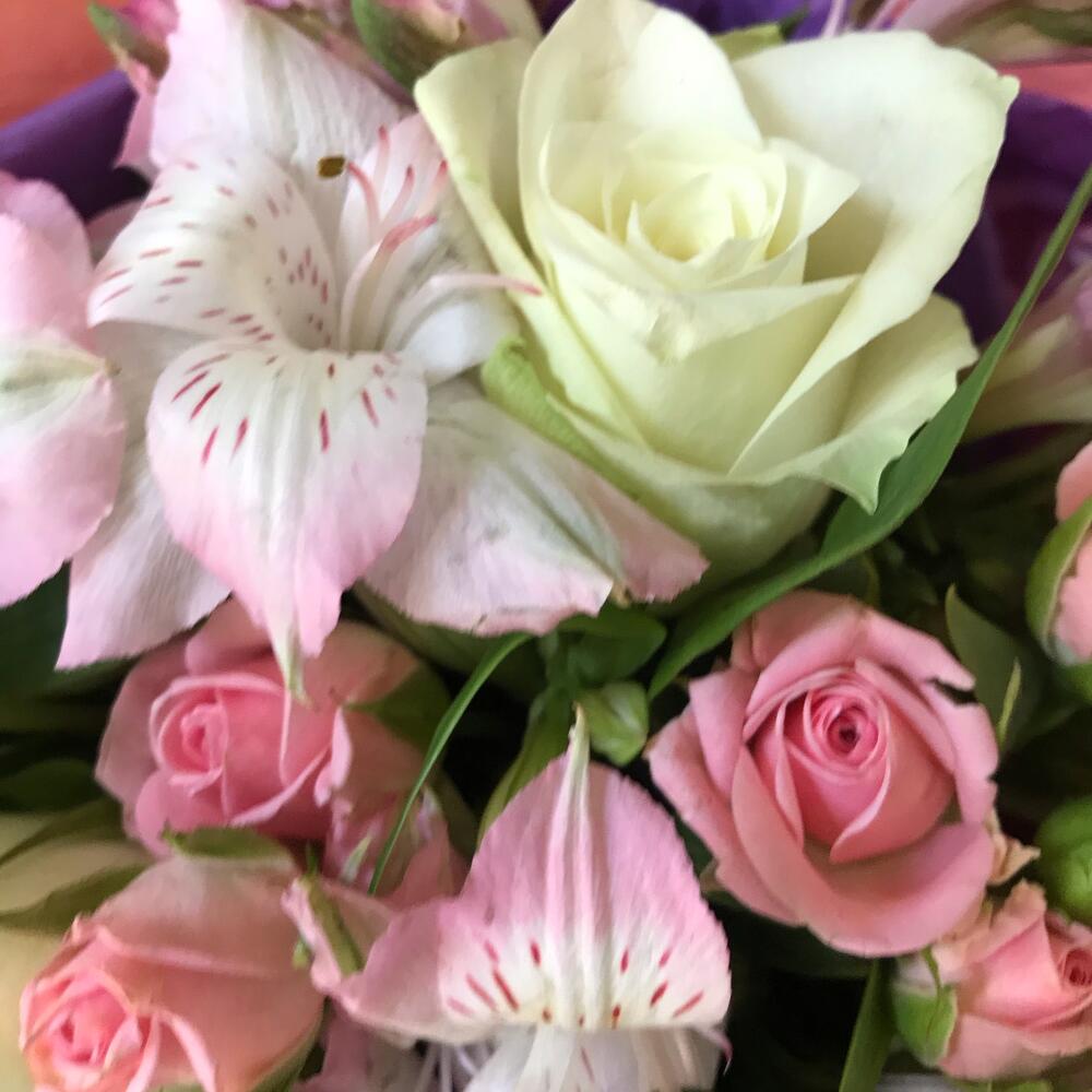 Альстромерия – 5 шт.Роза кустовая – 2 шт.Роза – 3 шт.Упаковка дизайнерская – 1 шт.