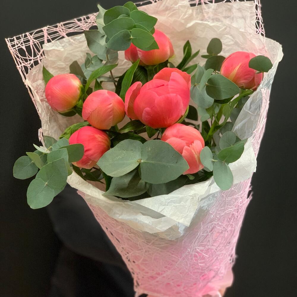 Тишью – 3 шт.Атласная лента – 1 шт.Дизайнерская упаковка – 1 шт.пионы – 7 шт.Эвкалипт – 1 шт.