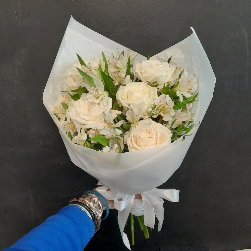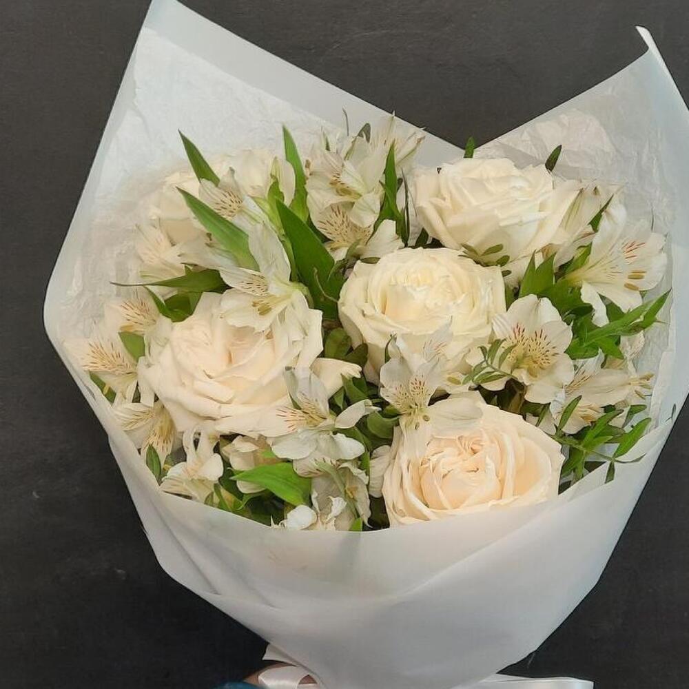 Роза белая – 5 шт. Альстромерия – 5 шт. Упаковка дизайнерская – 2 шт. Открыточка с вашими пожеланиями – 1 шт.