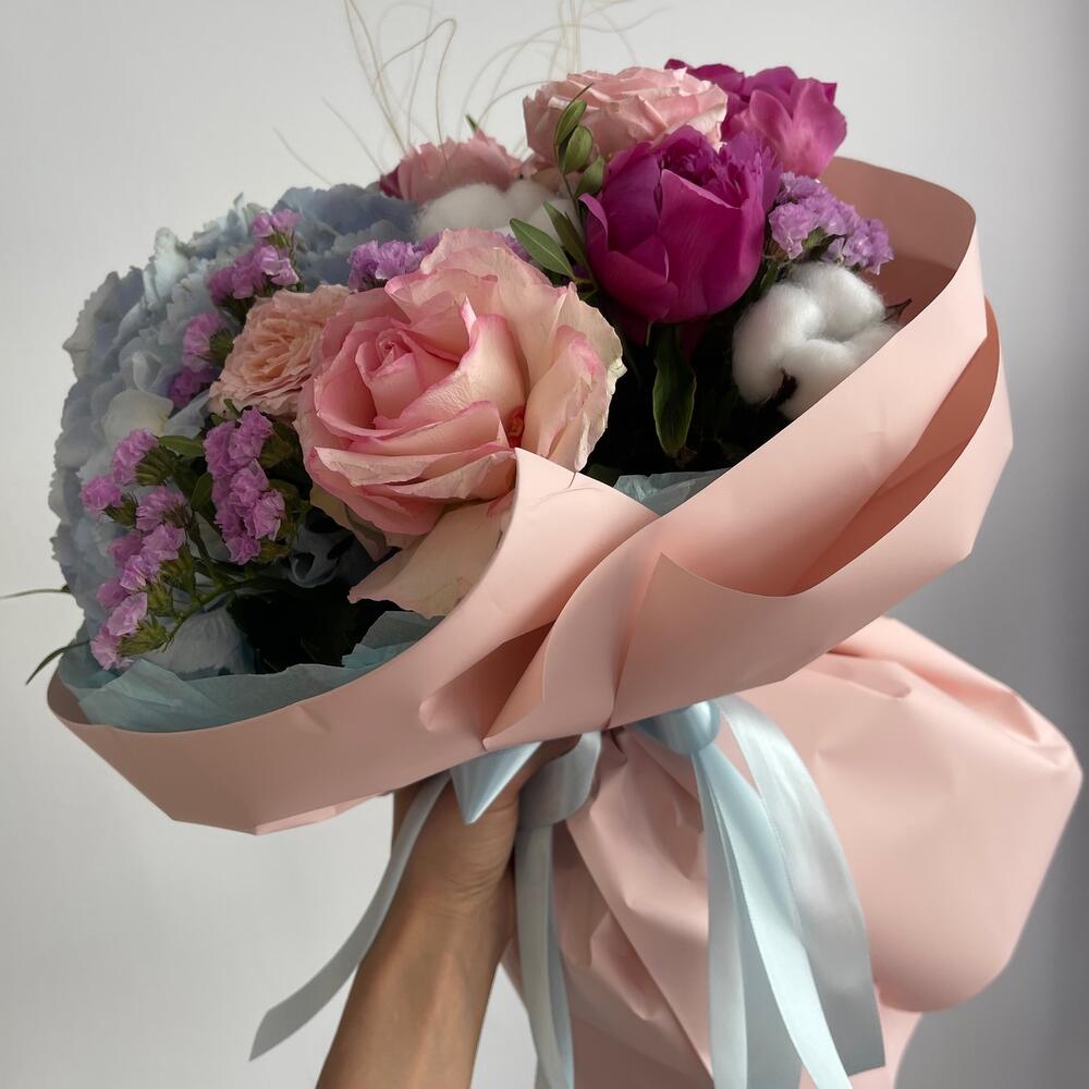 Гортензия – 1 шт.Пион – 3 шт.Статица – 1 шт.Тюльпан – 3 шт.Пленка – 4 шт.Хлопок натуральный – 2 шт.джульетта роза пионовидная – 1 шт.стифа пучок – 1 шт.
