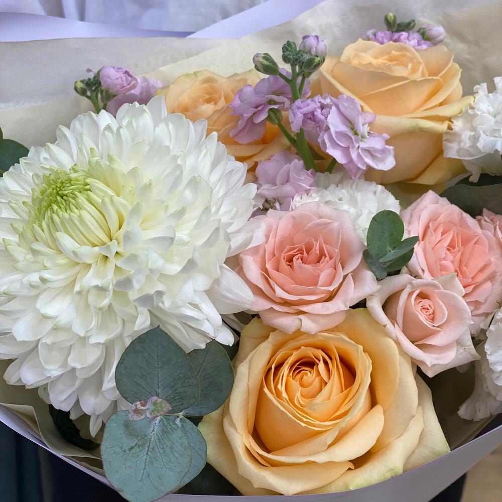 Роза кремовая – 3 шт.Кустовая роза – 1 шт.Упаковка дизайнерская – 1 шт.Хризантема белая – 1 шт.Эустома алиса – 1 шт.маттиола кустовая – 1 шт.эвкалипт 50 – 4 шт.