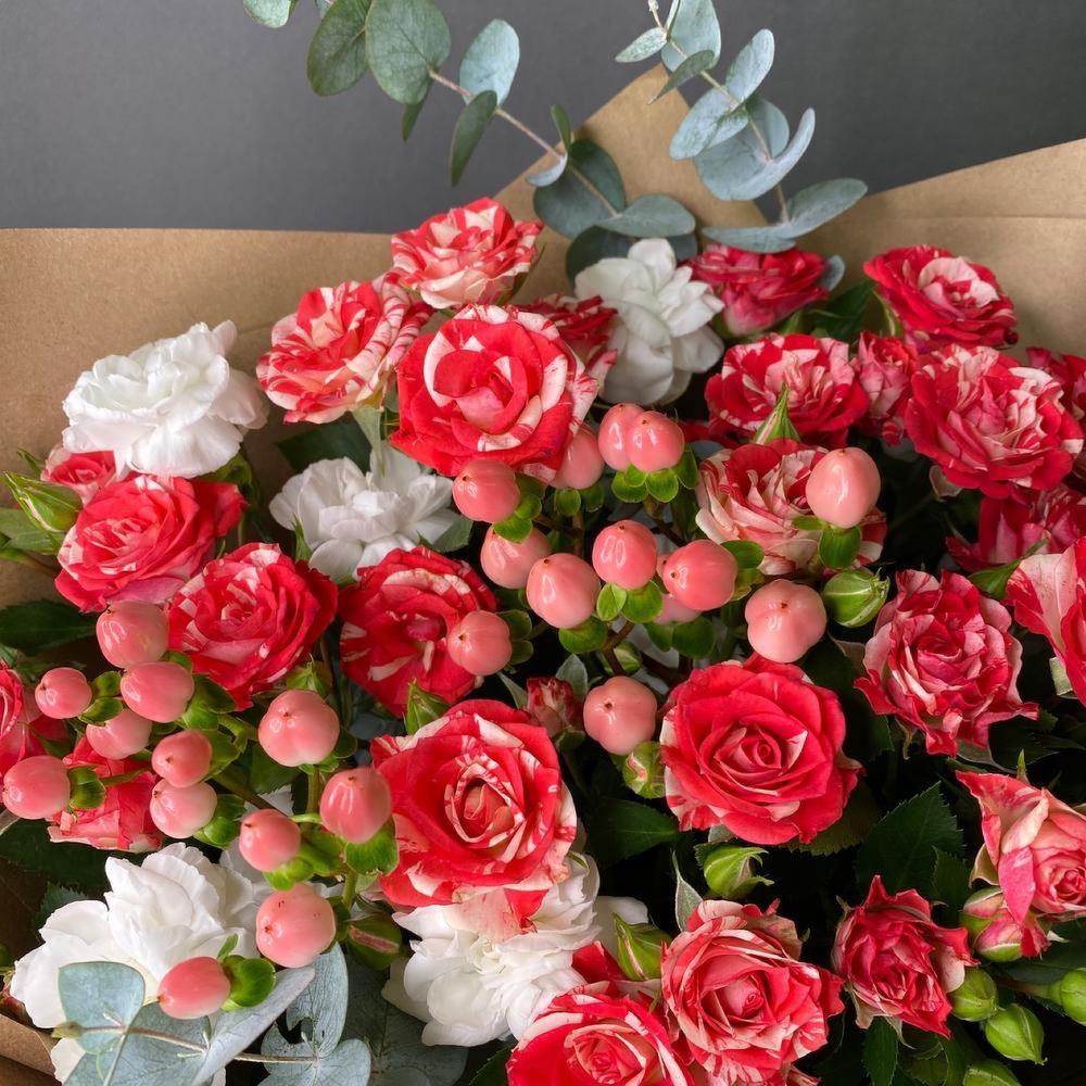 Гиперикум – 2 шт.Роза кустовая – 5 шт.Эвкалипт – 1 шт.Крафт упаковка – 2 шт.Диантус кустовой – 3 шт.джут лента коричневый – 1 шт.
