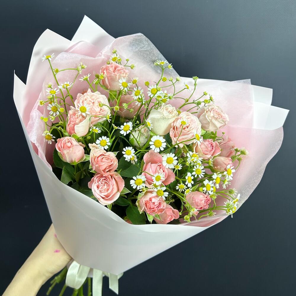 Матрикария – 4 шт.Кустовая роза розовая – 5 шт.Упаковка дизайнерская – 1 шт.