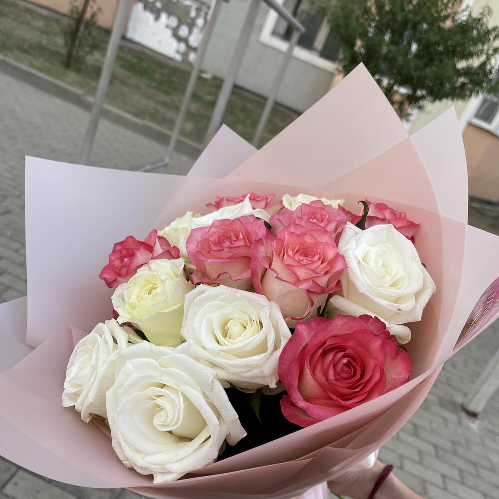 Упаковка – 1 шт. Атласная лента – 1 шт. белые и розовые розы – 15 шт.