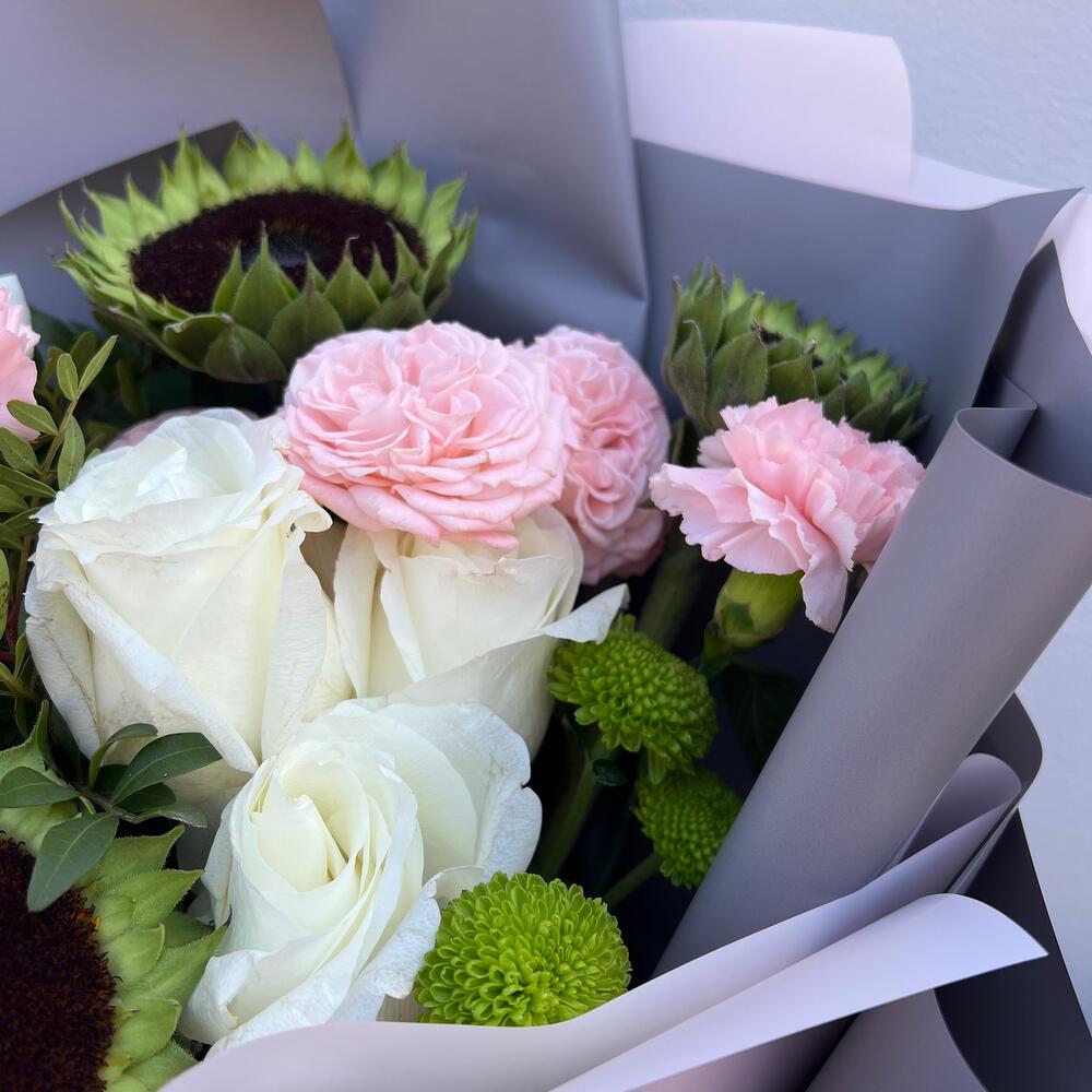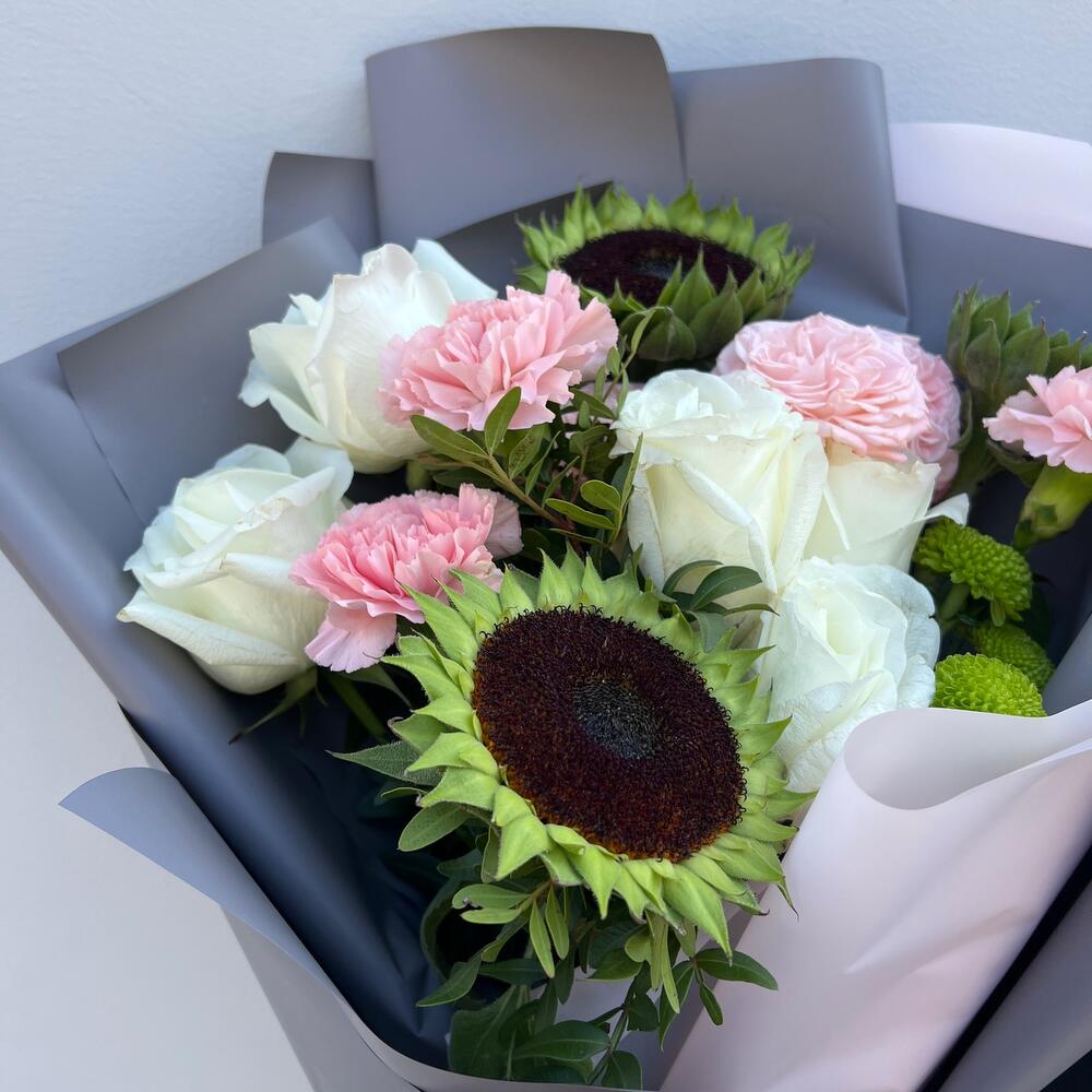 Подсолнух – 3 шт.Роза белая – 5 шт.Роза кустовая – 1 шт.Диантус – 3 шт.Пленка дизайнерская – 1 шт.Лента атласная – 1 шт.Хризантема кустовая – 1 шт.Фисташка – 1 шт.