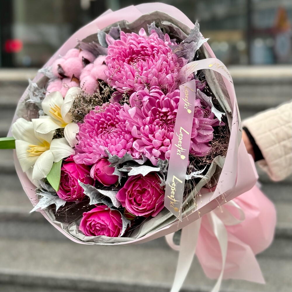 Альстромерии, Гвоздики, Кустовые розы, Лизиантусы, Розы, Хризантемы