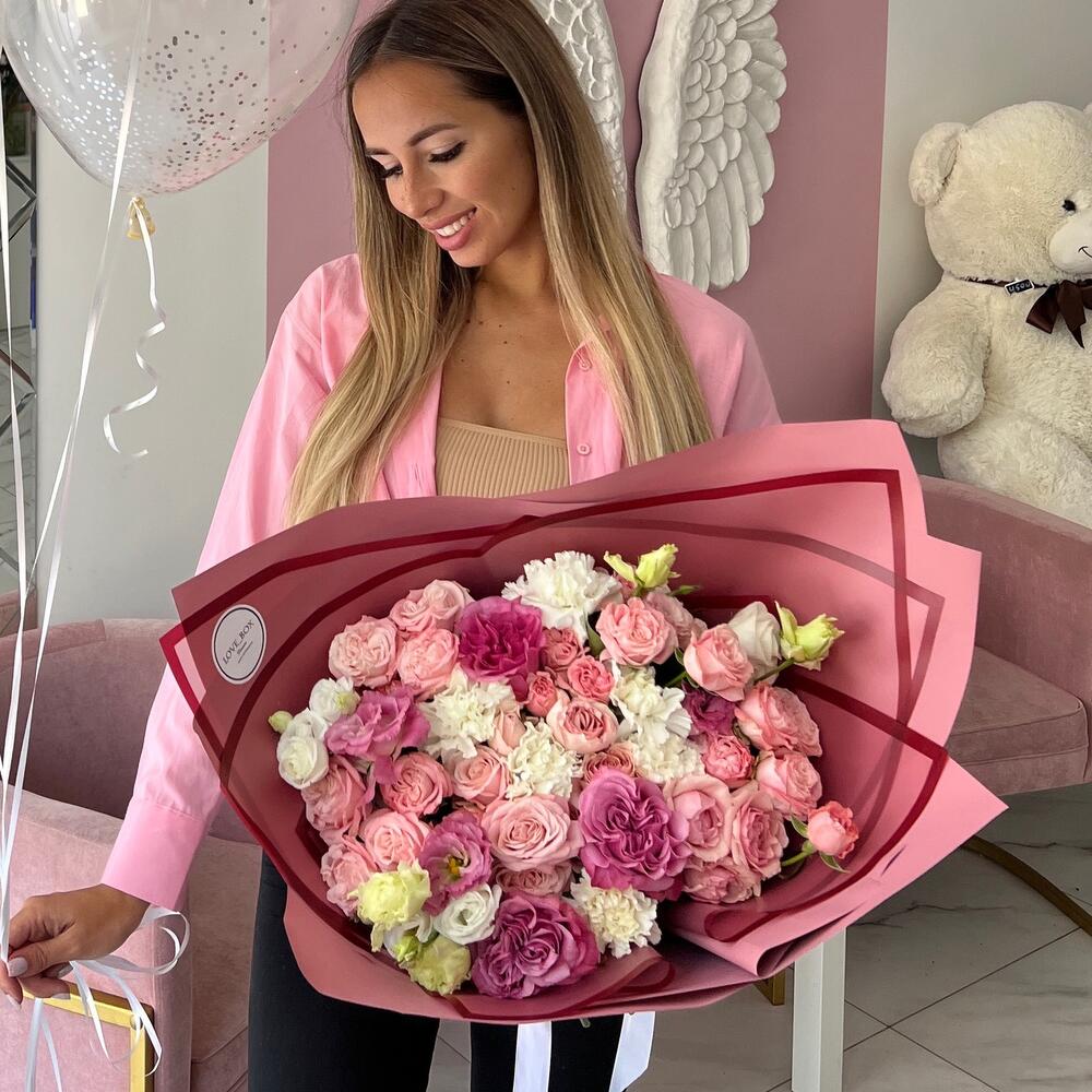 Пионовидная роза – 3 шт.Кустовая роза – 7 шт.Диантус – 5 шт.Эустома – 4 шт.Авторская упаковка – 5 шт.