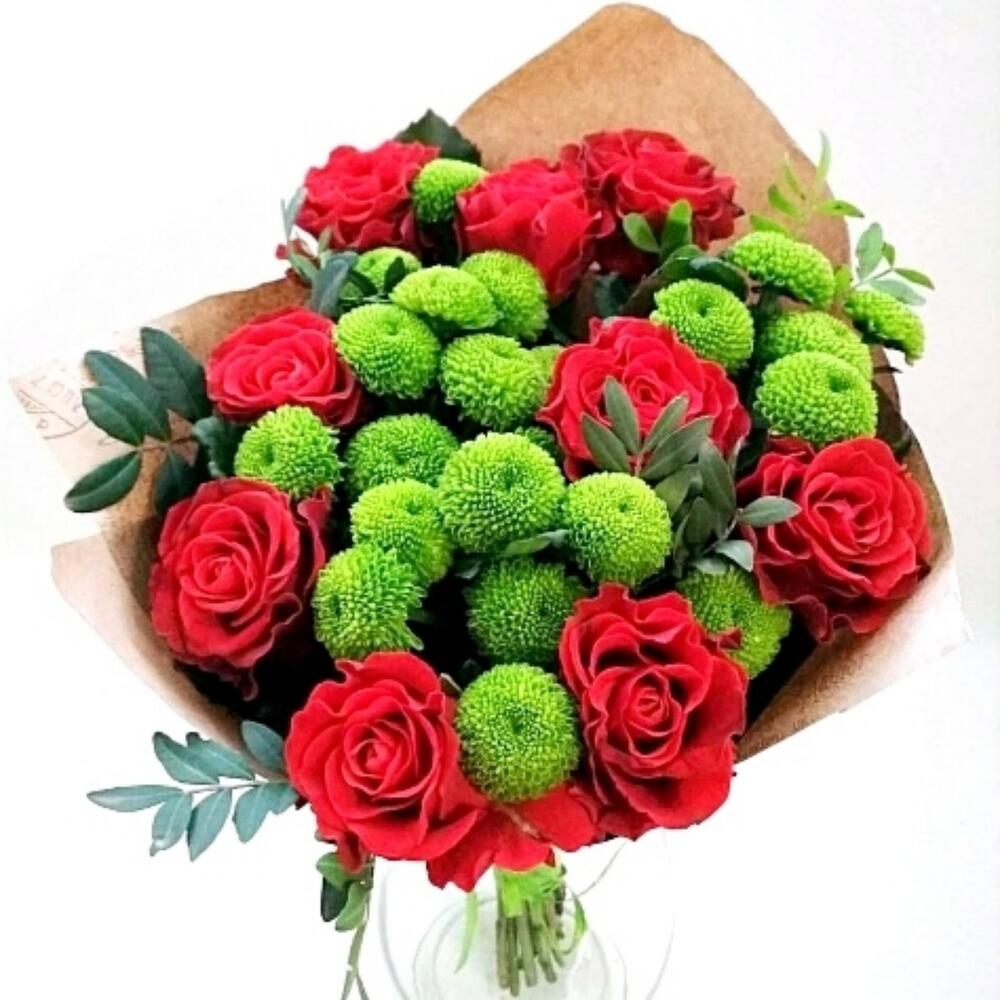 роза красная эль торо – 9 шт. Хризантема кустовая зеленая – 4 шт. зелень фисташка – 2 шт. оформление бумага – 1 шт.