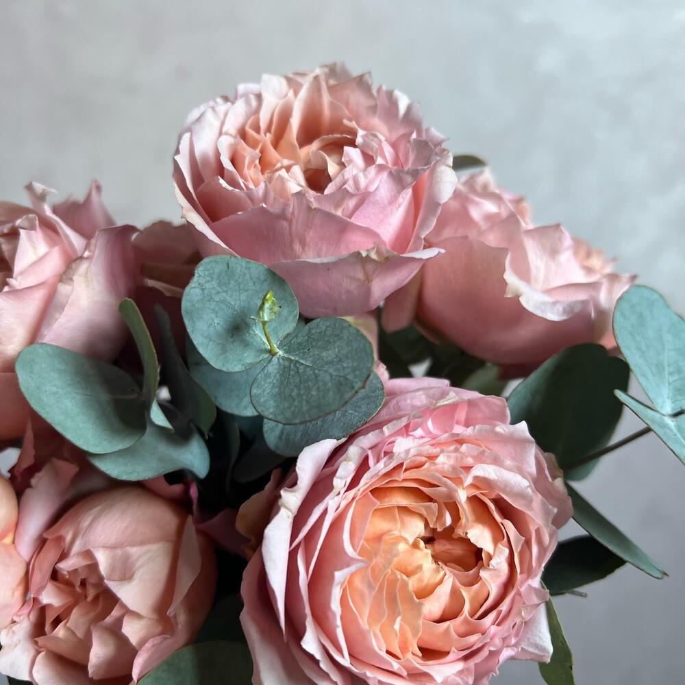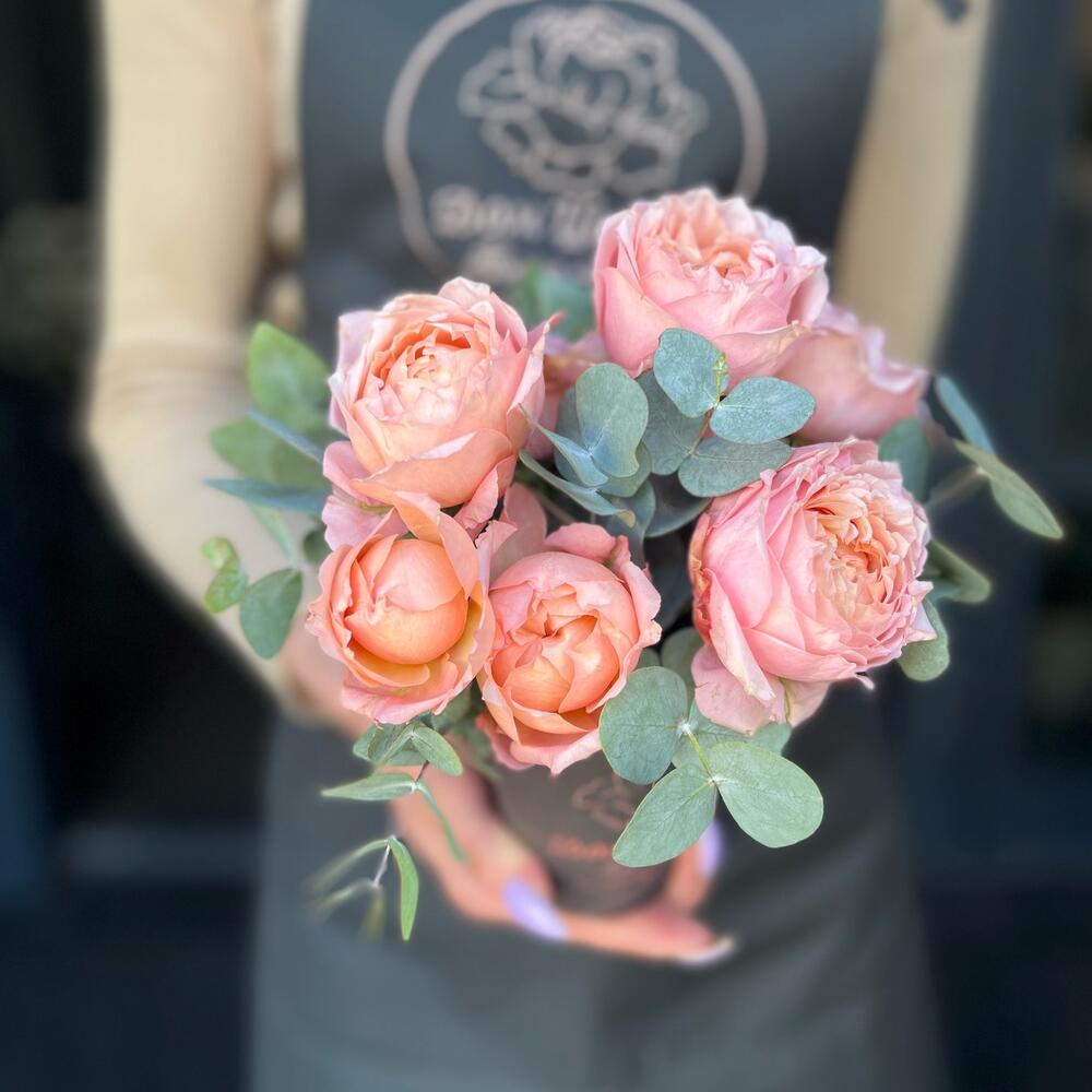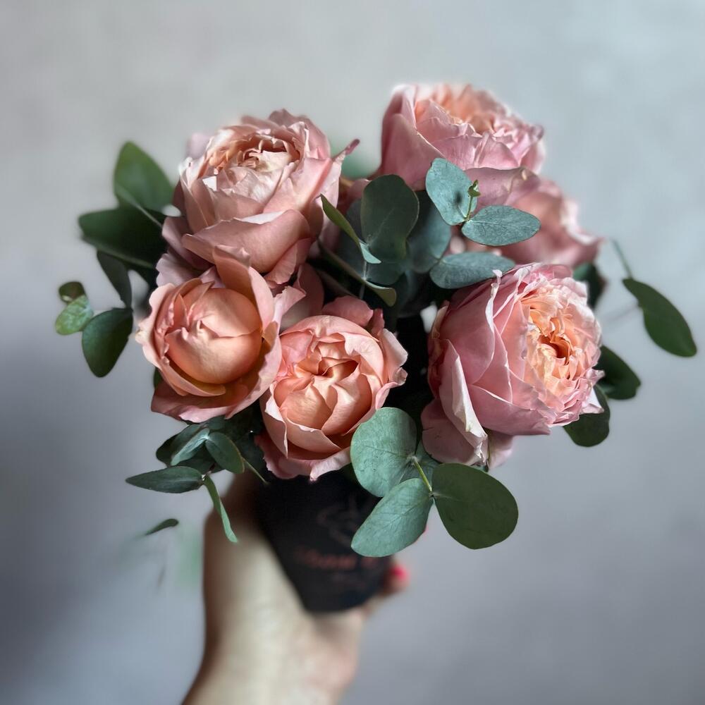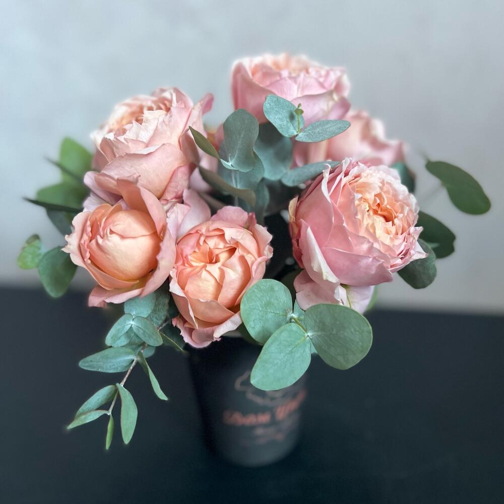 Стакан – 1 шт.Флористическая губка (оазис) – 1 шт.джульетта роза пионовидная – 1 шт.Эвкалипт – 2 шт.