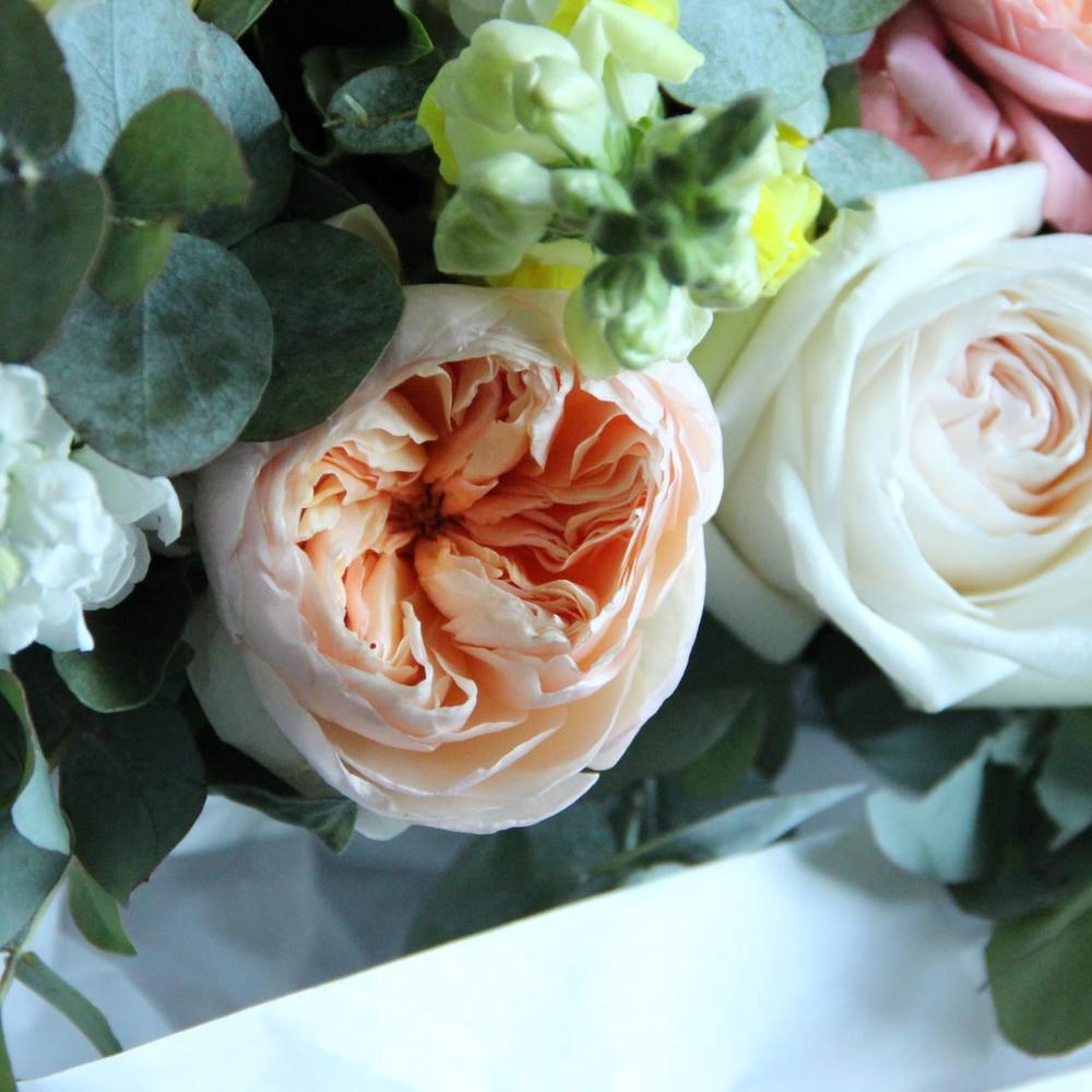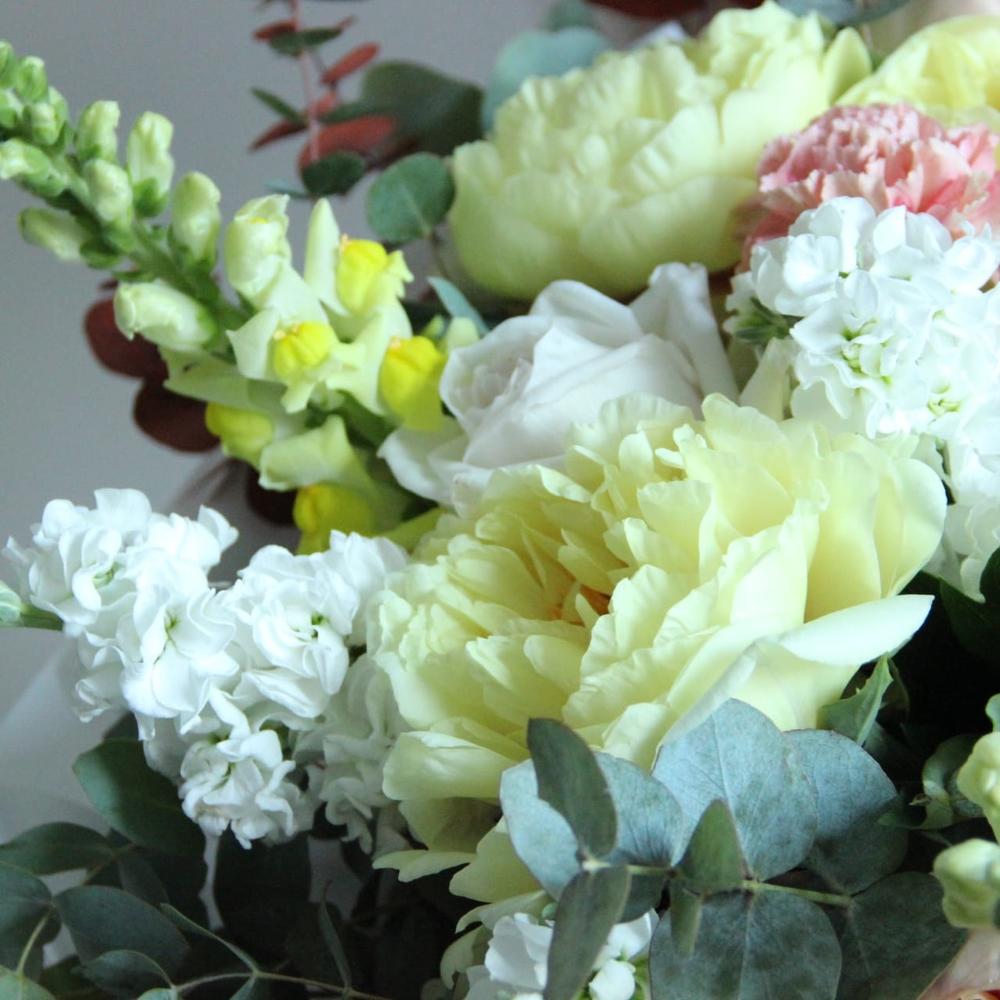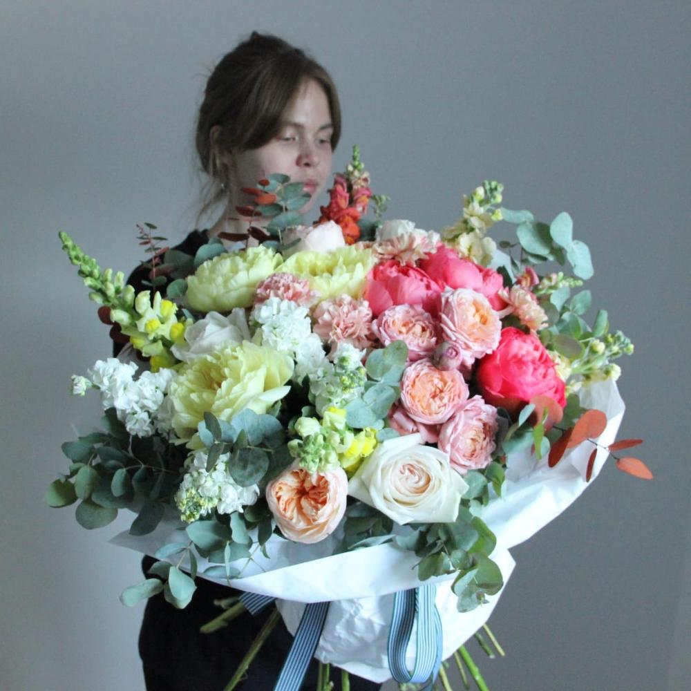 Пион Голландия – 6 шт.Львиный зев – 6 шт.Маттиола – 6 шт.Роза пионовидная – 7 шт.Роза пионовидная кустовая – 3 шт.Гвоздика – 5 шт.Эвкалипт – 9 шт.Бумага – 3 шт.Лента атласная – 2 шт.