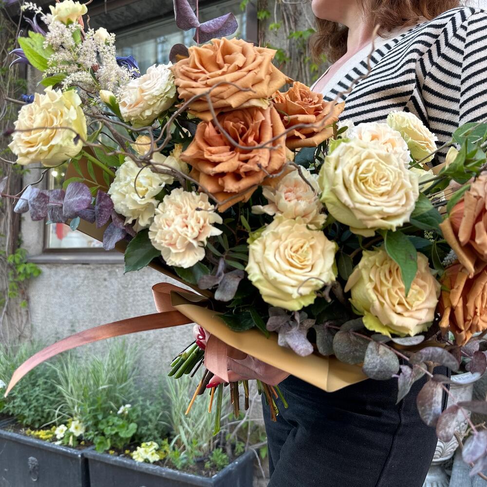 Астильба – 2 шт.Эвкалипт – 4 шт.Диантус – 7 шт.Орнитогалум – 2 шт.Роза пионовидная – 4 шт.Сухоцветы – 10 шт.Клематис – 2 шт.Роза кустовая пионовидная – 2 шт.Корилус – 2 шт.Роза шоколадная – 5 шт.Дизайнерская упаковка – 2 шт.атласный бант – 1 шт.