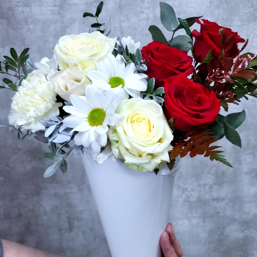 Хризантема кустовая – 1 шт.Роза – 5 шт.Гвоздика – 1 шт.Фисташка – 1 шт.Шляпная коробка – 1 шт.Оазис флористический – 1 шт.