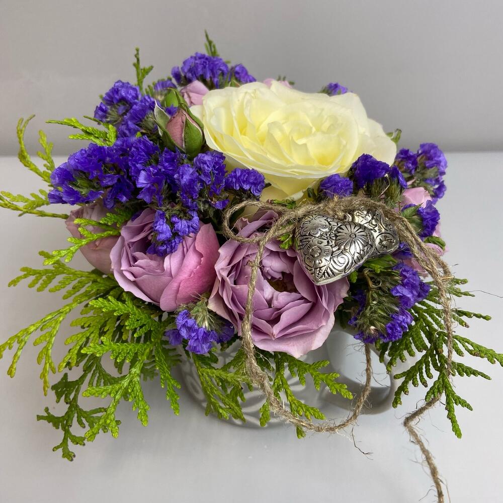 Роза одноголовая – 1 шт.Роза кустовая – 3 шт.Статица – 1 шт.туя ветка – 1 шт.Декор – 1 шт.Оазис флористический – 1 шт.кружка керамическая – 1 шт.