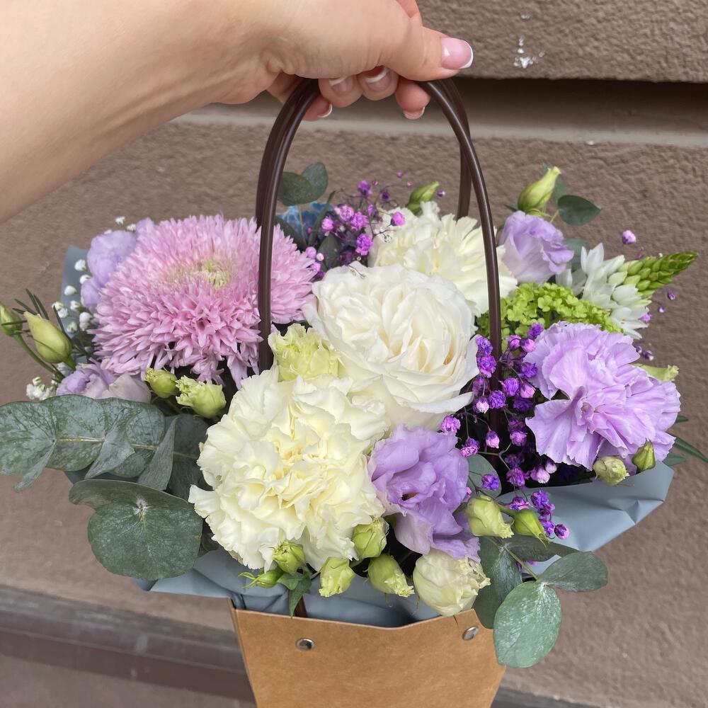 Роза пионовидная – 1 шт.Орнитогалум – 1 шт.Диантус – 4 шт.Эустома – 1 шт.Хризантема – 1 шт.Гипсофила – 1 шт.Эвкалипт – 1 шт.Фисташка – 1 шт.Оазис флористический – 1 шт.Упаковка – 1 шт.Сумка крафт – 1 шт.