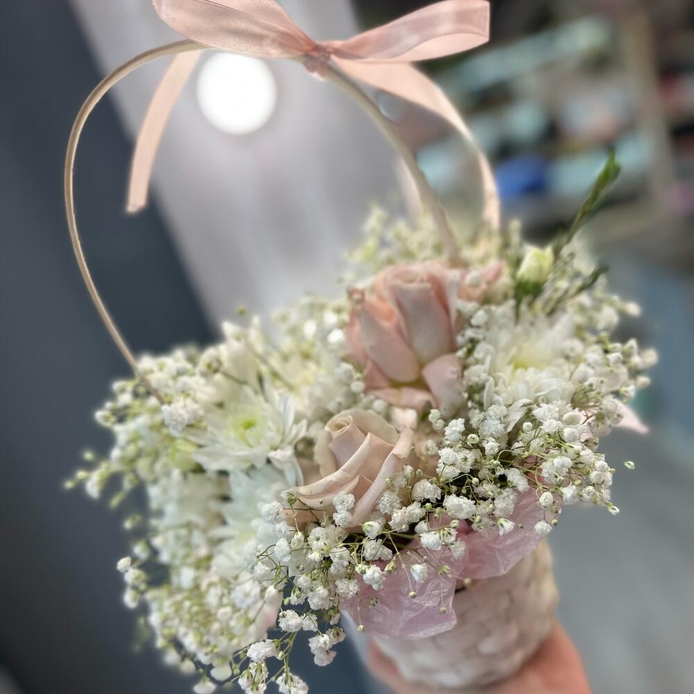 Гипсофила – 4 шт.Хризантема кустовая – 1 шт.Роза – 2 шт.Лента атласная – 1 шт.Тишью – 2 шт.Пленка – 1 шт.Корзина плетеная – 1 шт.Оазис флористический – 1 шт.