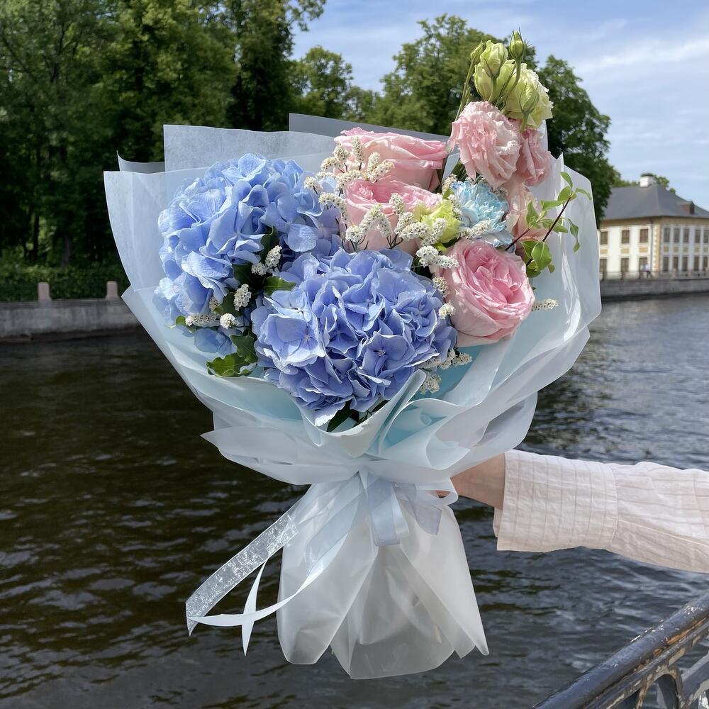 Гортензия – 2 шт.Роза пионовидная розовая – 3 шт.Лизиантус – 1 шт.Диантус – 1 шт.Лимониум – 1 шт.Питтоспорум – 2 шт.Упаковка дизайнерская – 1 шт.
