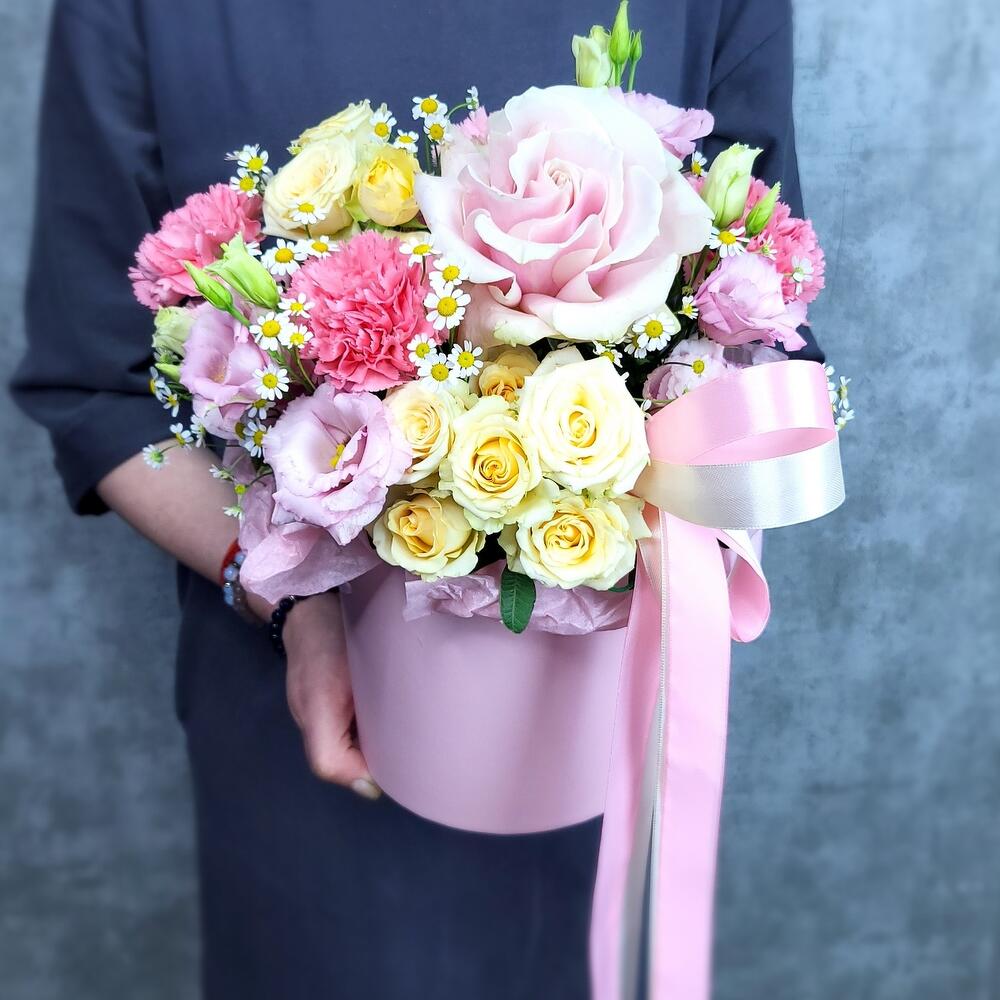 Роза Эквадор – 1 шт.Роза кустовая – 2 шт.Гвоздика – 3 шт.Лизиантус – 2 шт.Матрикария – 2 шт.Фисташка – 2 шт.Шляпная коробка – 1 шт.Оазис флористический – 1 шт.Лента атласная – 2 шт.