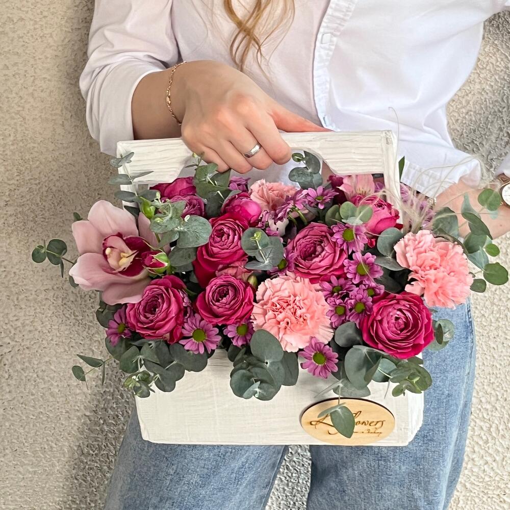 “Атлас☁️” – цветочная композиция с зефиром в деревянном ящике