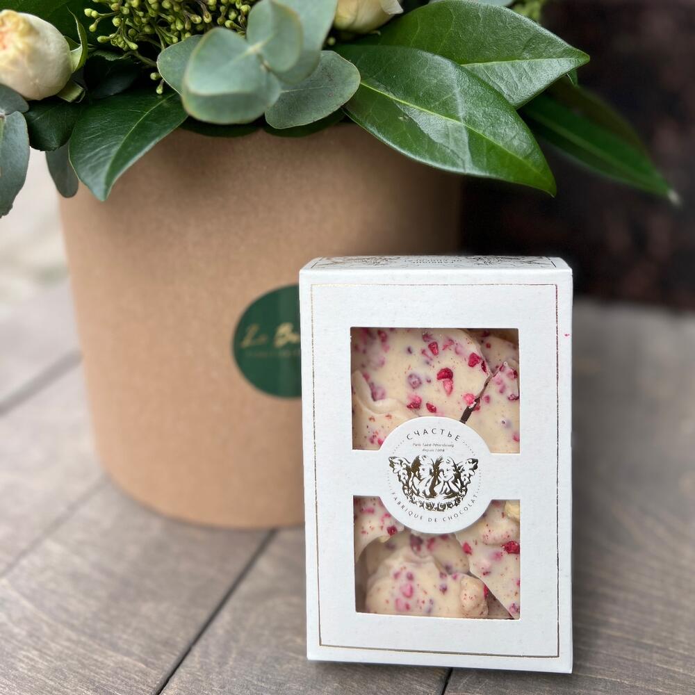 Лизиантус – 1 шт.Роза кустовая – 1 шт.Эвкалипт – 3 шт.Роза Эквадор – 1 шт.Шляпная коробка – 1 шт.Скиммия – 3 шт.Оазис флористический – 1 шт.Диантус сортовой – 4 шт.печенье «счастье» ангел – 1 шт.