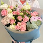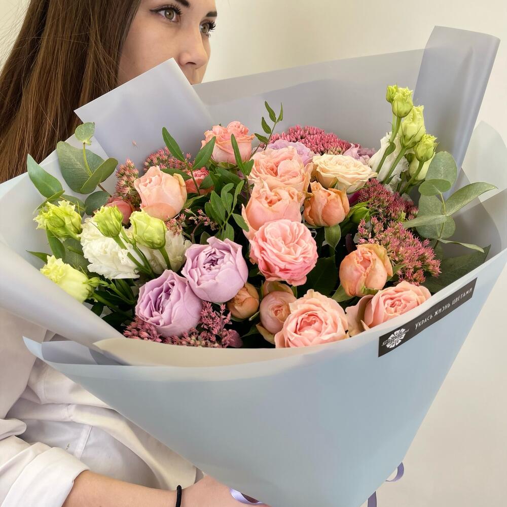Кустовая роза – 2 шт.Эустома – 2 шт.Фисташка – 1 шт.Упаковка дизайнерская – 2 шт.Райсфлауэр – 1 шт.Эвкалипт Baby Blue – 1 шт.Кустовая роза пионовидная – 3 шт.