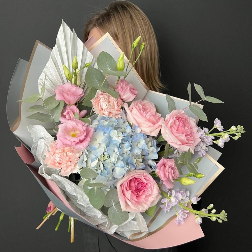 Гортензия – 1 шт.Лизиантус – 2 шт.Маттиола – 2 шт.Эвкалипт – 2 шт.Диантус – 2 шт.Роза пионовидная – 3 шт.Упаковка дизайнерская – 3 шт.Лист пальмы – 1 шт.