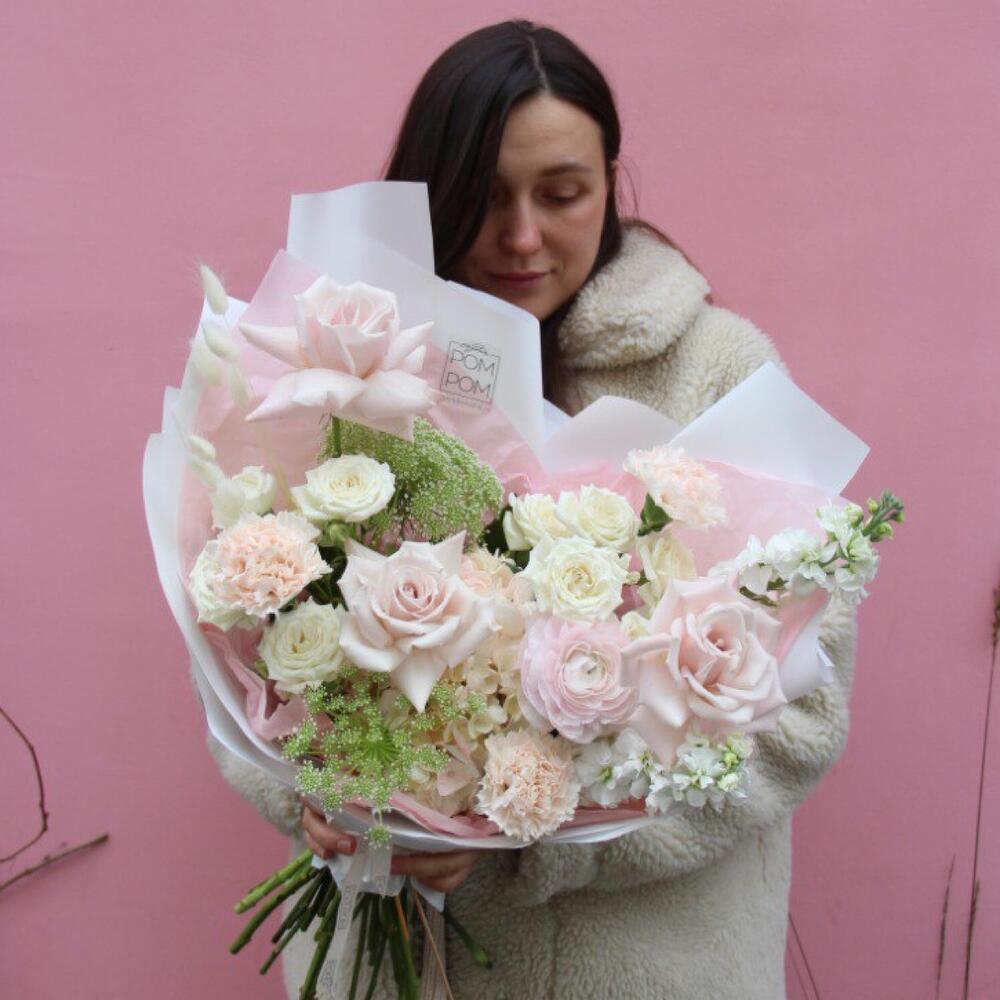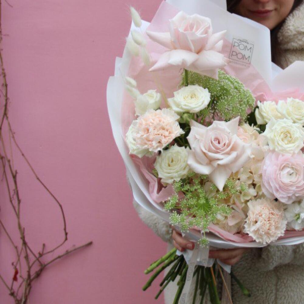 Роза – 5 шт.Амми – 2 шт.Маттиола – 2 шт.Гортензия – 1 шт.Гвоздика – 3 шт.Лагурус – 3 шт.Упаковка дизайнерская – 1 шт.