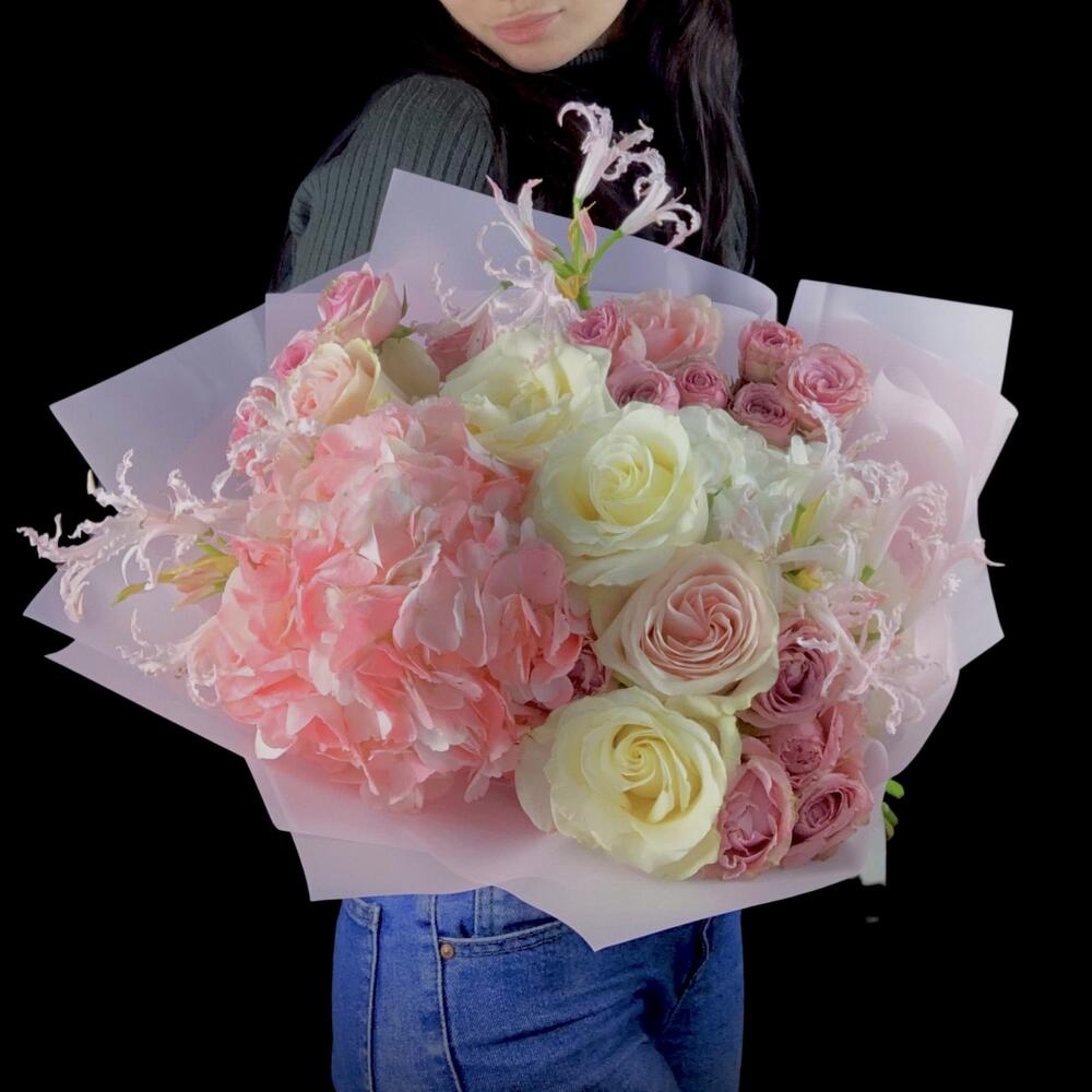 Альстромерии, Гортензии, Кустовые розы, Лизиантусы, Розы, Хризантемы