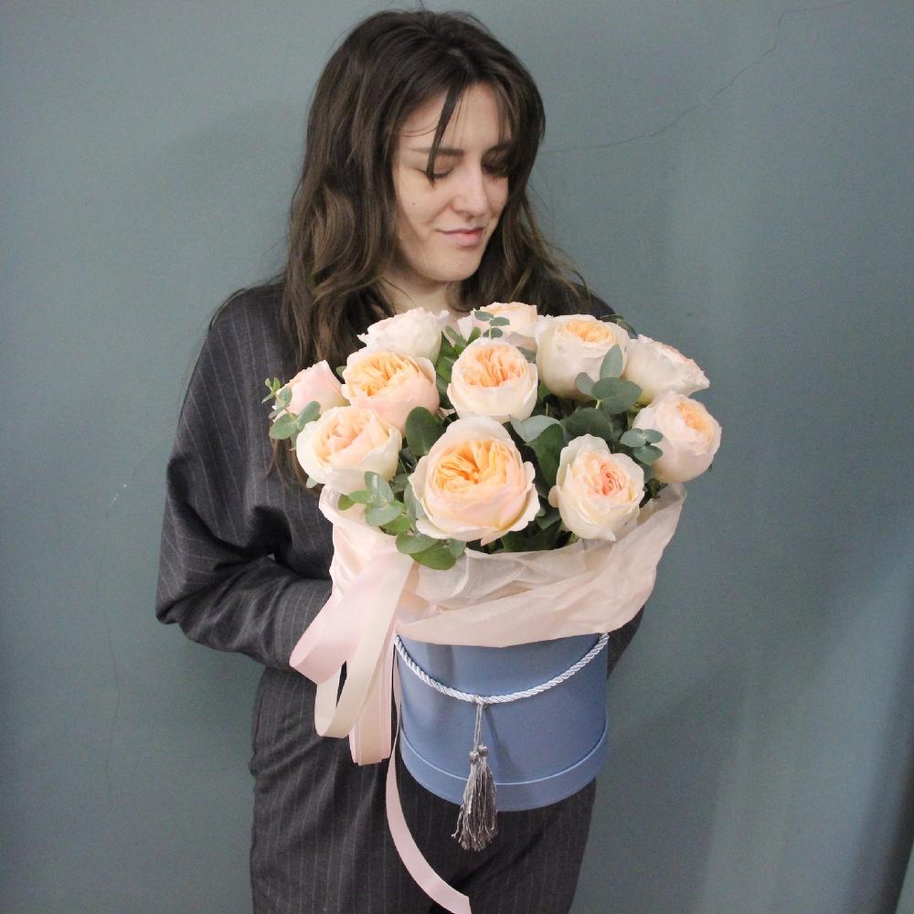 Шляпная коробка с 15 пионовидными английскими розами и эвкалиптом.Стильное цветочное решение для любого случая.Ширина композиции около 40смВысота композиции около 50см.