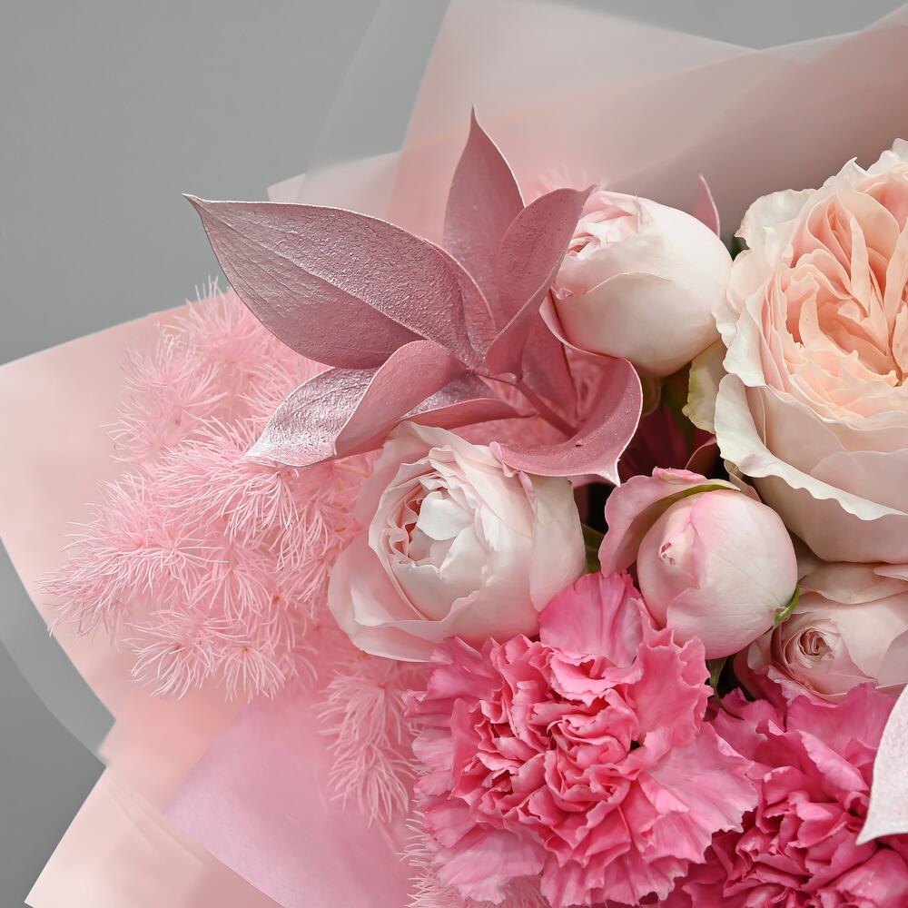 Нежный букет в розовой цветовой гамме. В составе пионовидная роза, кустовая пионовидная роза, похожая на пион, и сортовая гвоздика.Флористы студии Цветочный Этикет собрали его из самых свежих цветов, тщательно продумав состав. Букет готов удивлять красотой своего получателя! … Показать ещёСтанет идеальным подарком для любимой женщины, дочке или мамы, на День Рождения, юбилей, свадьбу и другие торжественные мероприятия. С букетом вы получите конверт с открыткой, в которой мы напишем любое пожелание, инструкцию свежести и средство для продления жизни срезанных цветов.